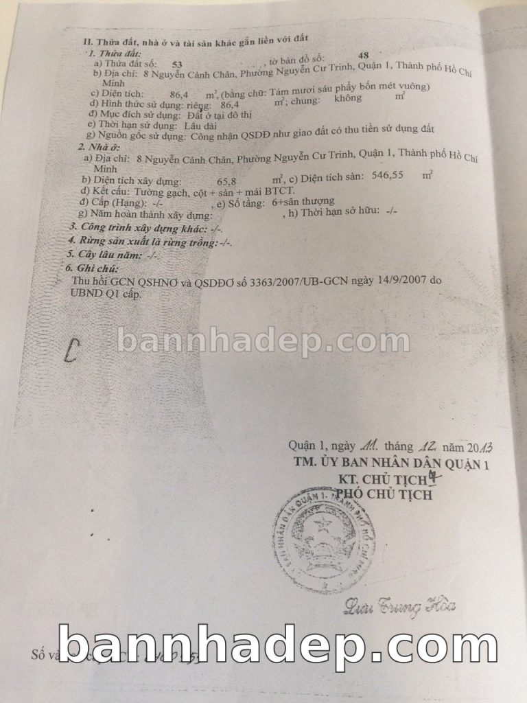 Bán nhà 8 Nguyễn Cảnh Chân phường Nguyễn Cư Trinh quận 1