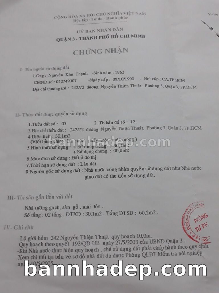 Bán nhà 242/72 Nguyễn Thiện Thuật phường 03 quận 3