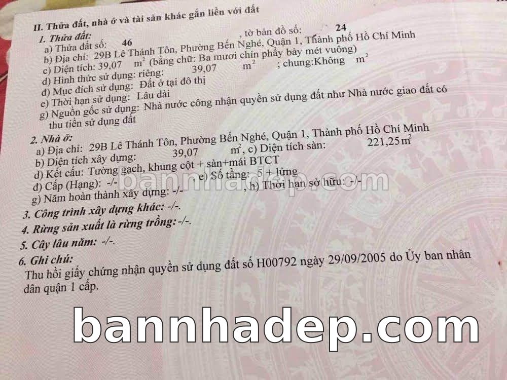 Bán nhà 29B Lê Thánh Tôn phường Bến Nghé quận 1