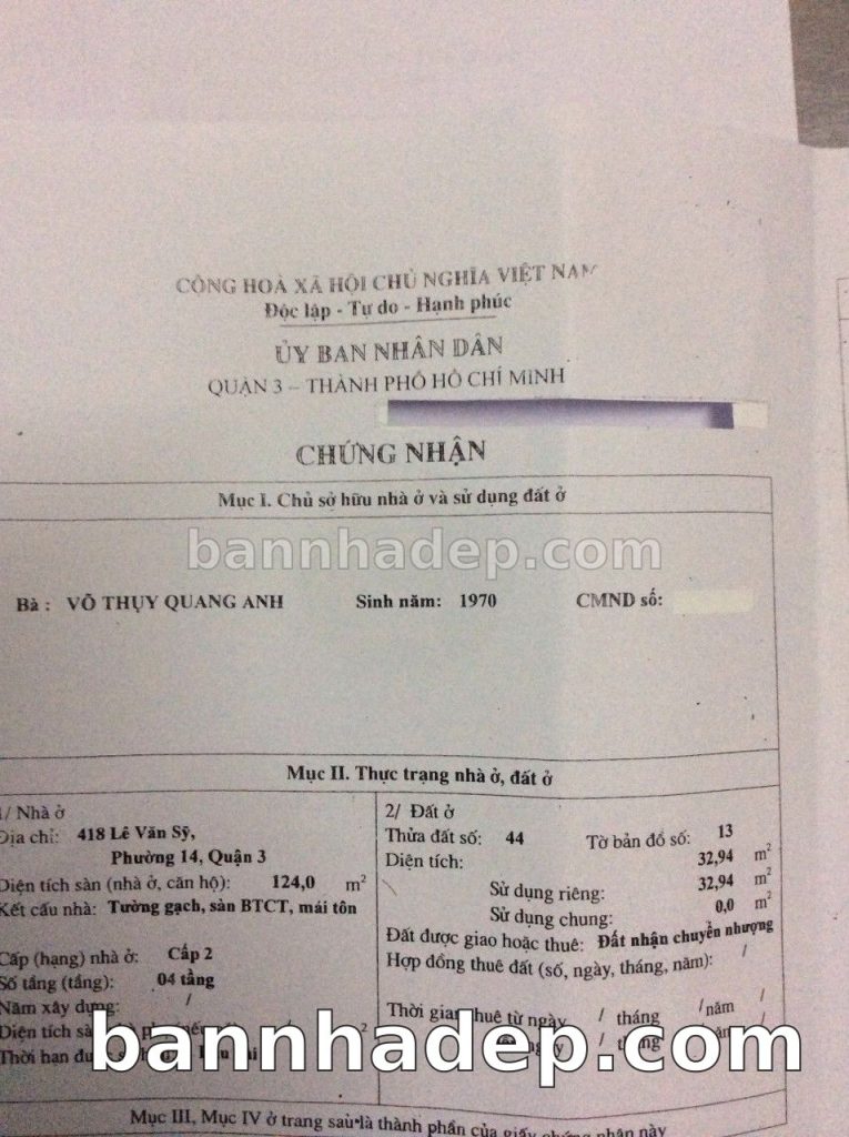 Bán nhà 398 Lê Văn Sỹ phường 01 quận 3