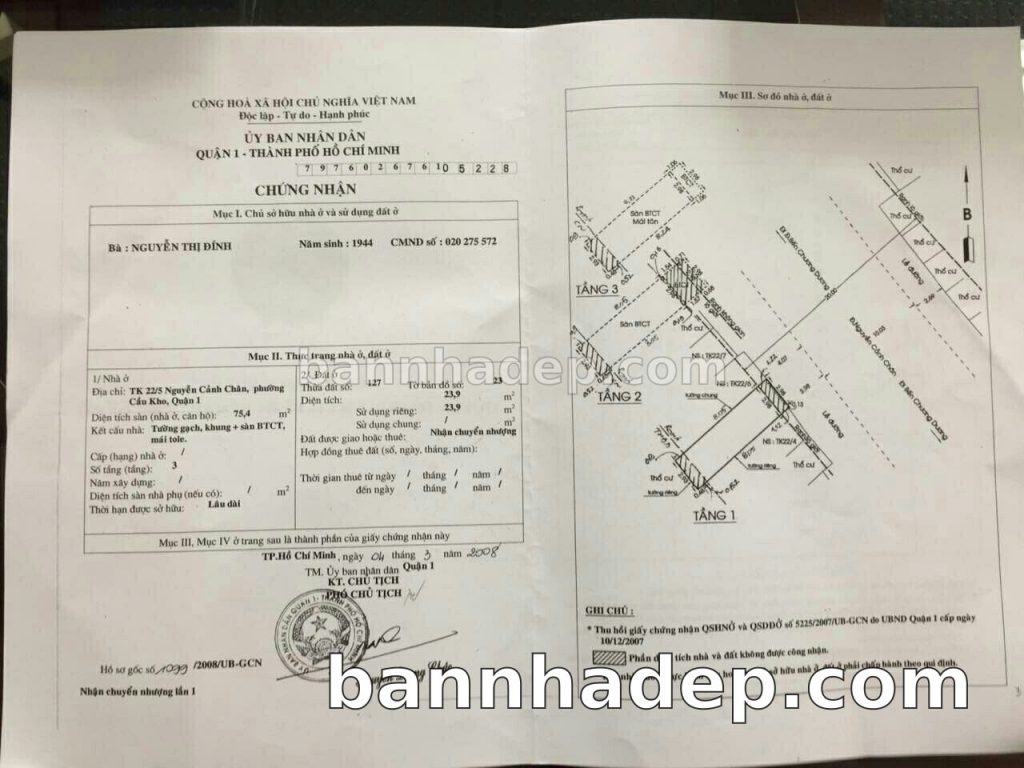 Bán nhà Tk 22/5 – 22/6 Nguyễn Cảnh Chân phường Cầu Kho quận 1