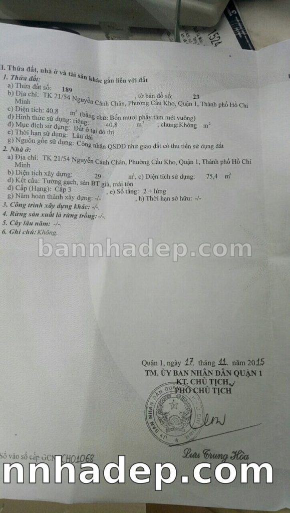Bán nhà TK21/54 Nguyễn Cảnh Chân phường Cầu Kho quận 1