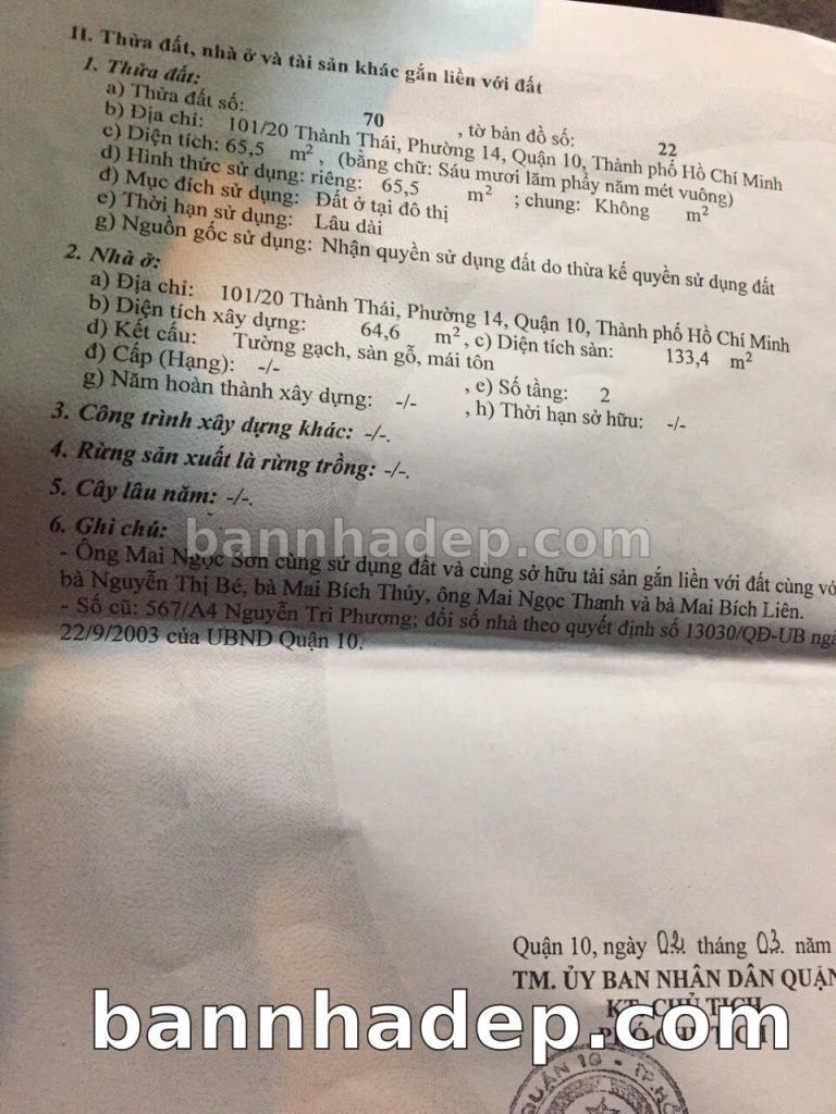 Bán nhà 101/20 Thành Thái phường 01 quận 10