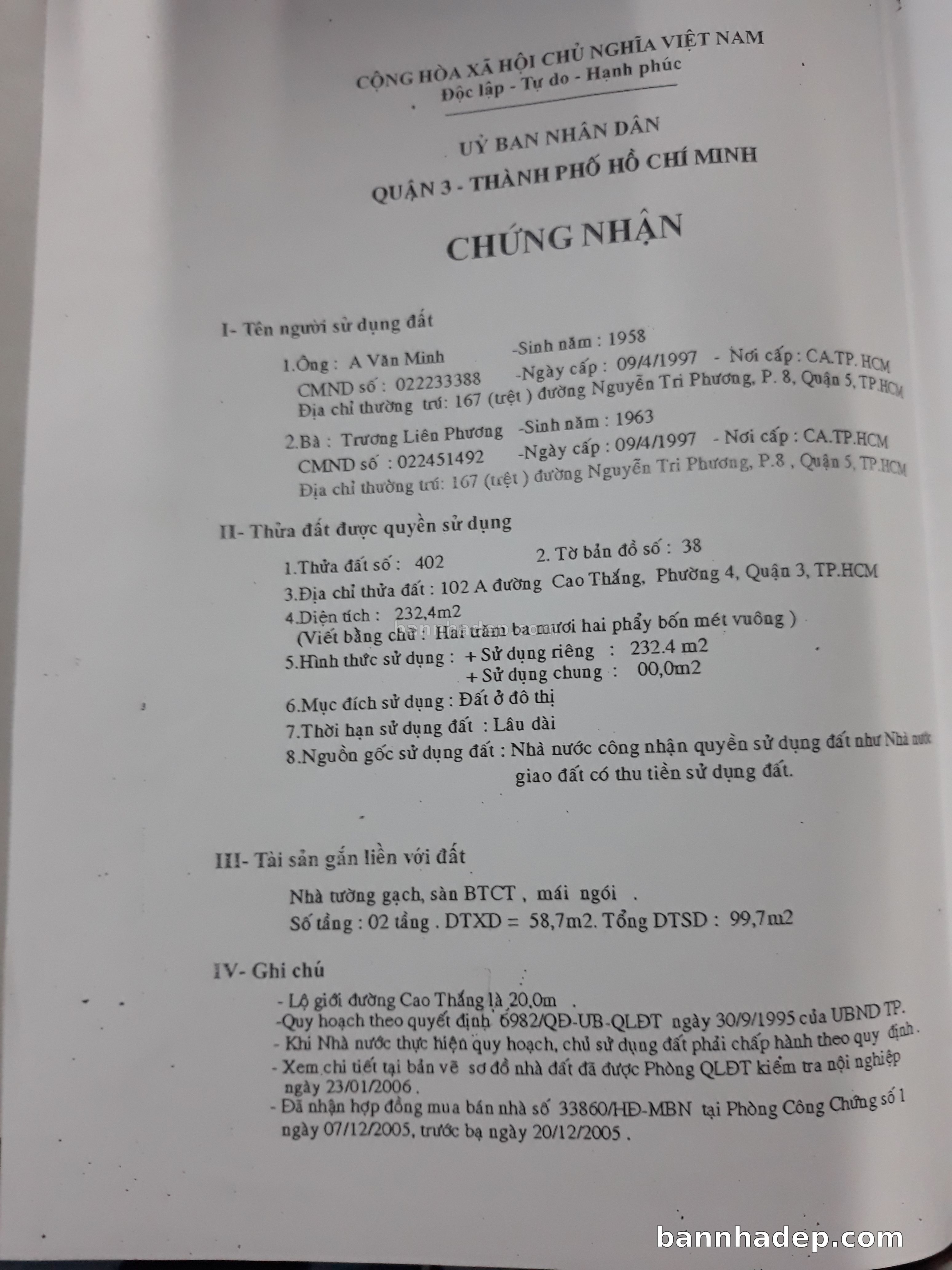 BÁN NHÀ Mặt tiền Số 102A Cao Thắng phường 04 quận 3 TP. Hồ Chí Minh – GẦN CÔNG VIÊN GIẢI TRÍ – GIÁ TỐT Cần bán gấp nhà Mặt tiền tại Số 102A Cao Thắng phường 04 quận 3 TP. Hồ Chí Minh – tiềm năng kinh doanh cao. Thông tin chi tiết: • Địa chỉ: Số 102A Cao Thắng phường 04 quận 3 TP. Hồ Chí Minh • Diện tích: như trong sổ, không gian lý tưởng • Vị trí: Mặt tiền đường Cao Thắng, gần trung tâm thương mại lớn, khu vực sầm uất, tiềm năng kinh doanh cao • Pháp lý: Sổ hồng riêng, không tranh chấp, sẵn sàng giao dịch • Giá bán: Thoả Thuận (còn thương lượng với khách thiện chí) Lợi thế đặc biệt: • Vị trí trung tâm Quận 3 • Giao thông thuận tiện, kết nối các quận trung tâm • Phù hợp kinh doanh dài hạn, ổn định • Khu vực sầm uất, tiềm năng kinh doanh tốt