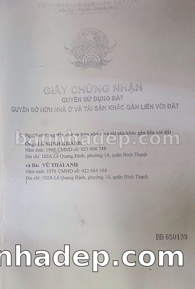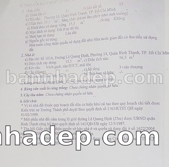 BÁN NHÀ Mặt tiền Số 102A Lê Quang Định phường 01 quận Bình Thạnh TP. Hồ Chí Minh – GẦN CÔNG VIÊN GIẢI TRÍ – GIÁ TỐT Cần bán gấp nhà Mặt tiền tại Số 102A Lê Quang Định phường 01 quận Bình Thạnh TP. Hồ Chí Minh – tiềm năng kinh doanh cao. Thông tin chi tiết: • Địa chỉ: Số 102A Lê Quang Định phường 01 quận Bình Thạnh TP. Hồ Chí Minh • Diện tích: như trong sổ, không gian lý tưởng • Vị trí: Mặt tiền đường Lê Quang Định, gần trung tâm thương mại lớn, khu vực sầm uất, tiềm năng kinh doanh cao • Pháp lý: Sổ hồng riêng, không tranh chấp, sẵn sàng giao dịch • Giá bán: Thoả Thuận (còn thương lượng với khách thiện chí) Lợi thế đặc biệt: • Vị trí trung tâm Quận Bình Thạnh • Giao thông thuận tiện, kết nối các quận trung tâm • Phù hợp kinh doanh dài hạn, ổn định • Khu vực sầm uất, tiềm năng kinh doanh tốt
