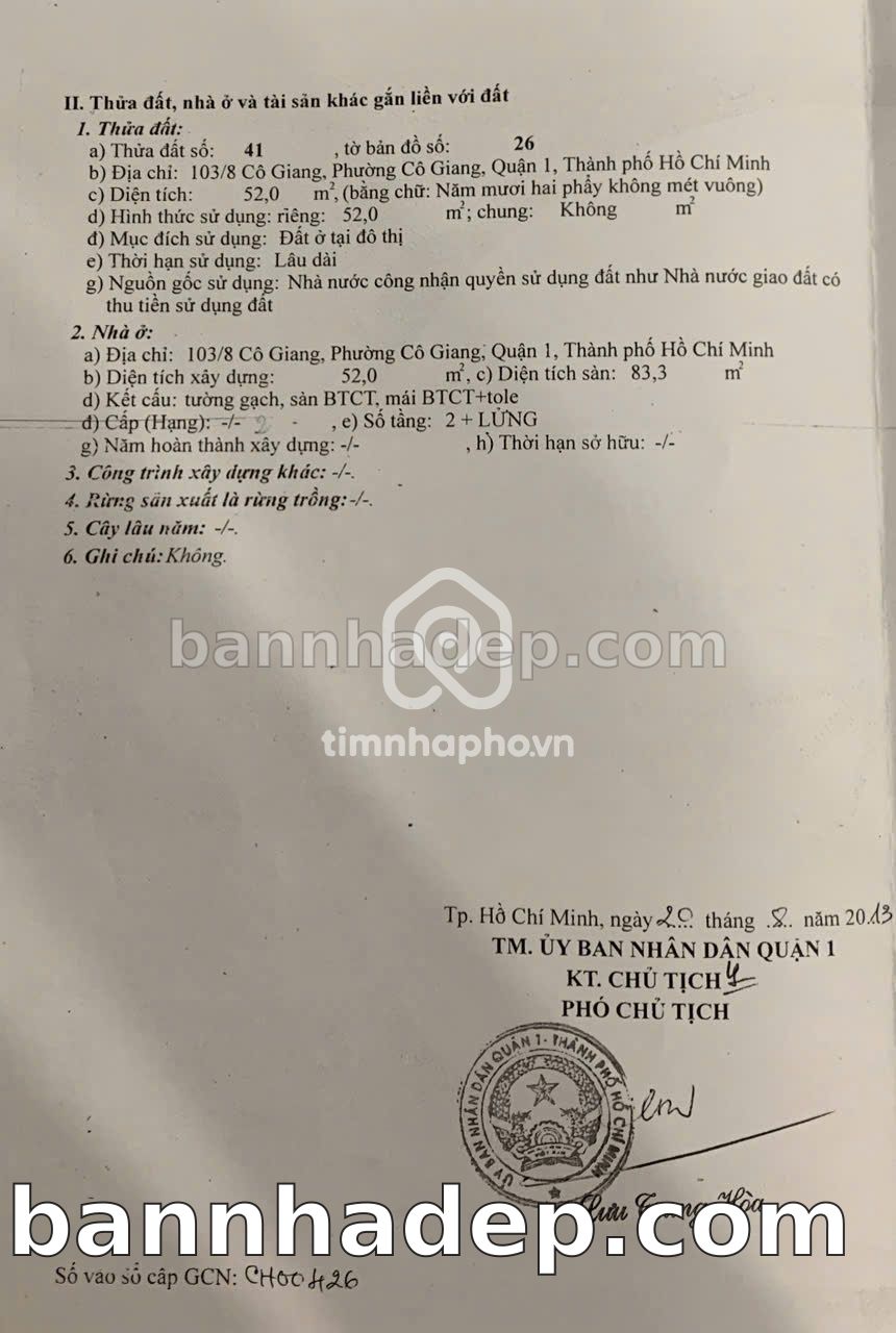 BÁN NHÀ MẶT TIỀN Số 103/8 Cô Giang Phường Cô Giang Quận 1 TP. Hồ Chí Minh – GẦN CÔNG VIÊN GIẢI TRÍ – GIÁ TỐT 12 TỶ Cần bán gấp nhà mặt tiền tại Số 103/8 Cô Giang Phường Cô Giang Quận 1 TP. Hồ Chí Minh – tiềm năng kinh doanh cao. Thông tin chi tiết: • Địa chỉ: Số 103/8 Cô Giang Phường Cô Giang Quận 1 TP. Hồ Chí Minh • Diện tích: 4.2m x 14.0m, mặt tiền rộng • Vị trí: Mặt tiền đường Cô Giang, gần công viên giải trí, khu vực đông dân cư, tiềm năng kinh doanh tốt • Pháp lý: Sổ hồng riêng, quy hoạch rõ ràng, sẵn sàng sang tên • Giá bán: 12 Tỷ (giá tốt cho khách thiện chí) Điểm mạnh: • Vị trí đắc địa, tiềm năng sinh lời cao • Mặt tiền rộng, giá trị khai thác thương mại cao • Vị trí trung tâm Quận 1, thuận tiện kết nối Quận 1, 2, 7 • Gần các tiện ích quan trọng: bệnh viện, trung tâm thương mại, công viên