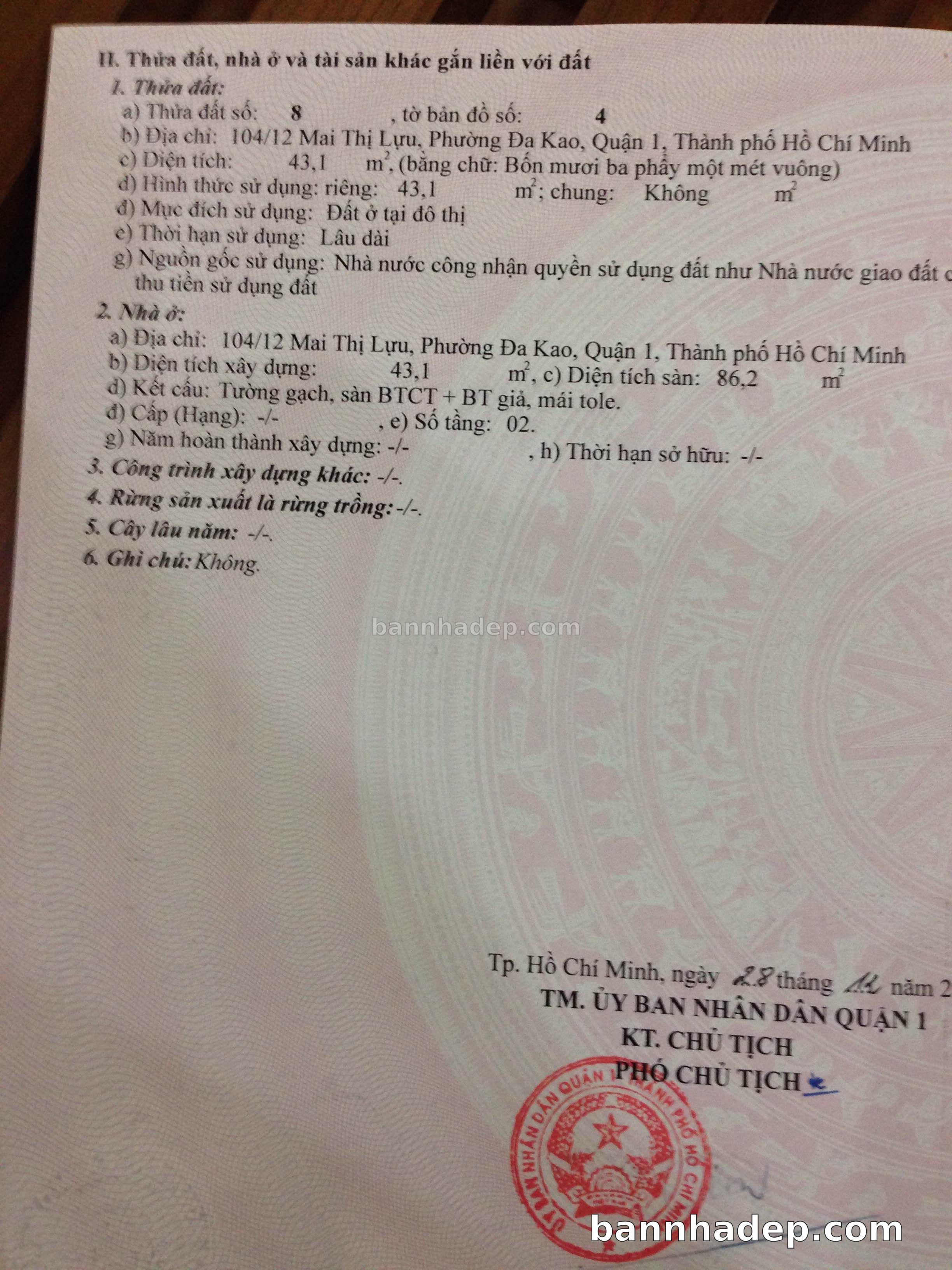 BÁN NHÀ Đường hẻm Số 104/12 Mai Thị Lựu phường Đa Kao quận 1 TP. Hồ Chí Minh – GẦN CÔNG VIÊN GIẢI TRÍ – GIÁ TỐT Cần bán gấp nhà Đường hẻm tại Số 104/12 Mai Thị Lựu phường Đa Kao quận 1 TP. Hồ Chí Minh – tiềm năng kinh doanh cao. Thông tin chi tiết: • Địa chỉ: Số 104/12 Mai Thị Lựu phường Đa Kao quận 1 TP. Hồ Chí Minh • Diện tích: như trong sổ, không gian lý tưởng • Vị trí: Đường hẻm đường Mai Thị Lựu, gần trung tâm thương mại lớn, khu vực sầm uất, tiềm năng kinh doanh cao • Pháp lý: Sổ hồng riêng, không tranh chấp, sẵn sàng giao dịch • Giá bán: Thoả Thuận (còn thương lượng với khách thiện chí) Lợi thế đặc biệt: • Vị trí trung tâm Quận 1 • Giao thông thuận tiện, kết nối các quận trung tâm • Phù hợp kinh doanh dài hạn, ổn định • Khu vực sầm uất, tiềm năng kinh doanh tốt