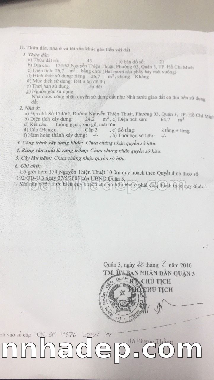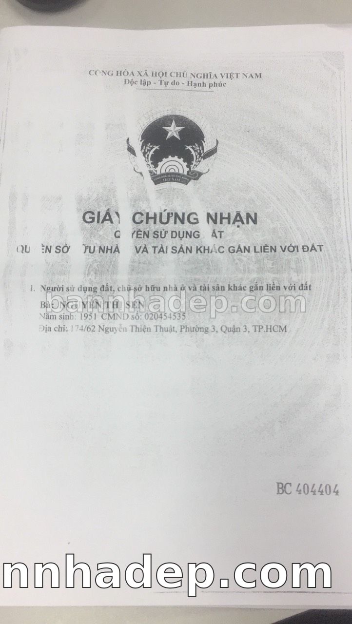 BÁN NHÀ Đường hẻm Số 174/62 Nguyễn Thiện Thuật phường 03 quận 3 TP. Hồ Chí Minh – GẦN CÔNG VIÊN GIẢI TRÍ – GIÁ TỐT Cần bán gấp nhà Đường hẻm tại Số 174/62 Nguyễn Thiện Thuật phường 03 quận 3 TP. Hồ Chí Minh – tiềm năng kinh doanh cao. Thông tin chi tiết: • Địa chỉ: Số 174/62 Nguyễn Thiện Thuật phường 03 quận 3 TP. Hồ Chí Minh • Diện tích: như trong sổ, không gian lý tưởng • Vị trí: Đường hẻm đường Nguyễn Thiện Thuật, gần trung tâm thương mại lớn, khu vực sầm uất, tiềm năng kinh doanh cao • Pháp lý: Sổ hồng riêng, không tranh chấp, sẵn sàng giao dịch • Giá bán: Thoả Thuận (còn thương lượng với khách thiện chí) Lợi thế đặc biệt: • Vị trí trung tâm Quận 3 • Giao thông thuận tiện, kết nối các quận trung tâm • Phù hợp kinh doanh dài hạn, ổn định • Khu vực sầm uất, tiềm năng kinh doanh tốt