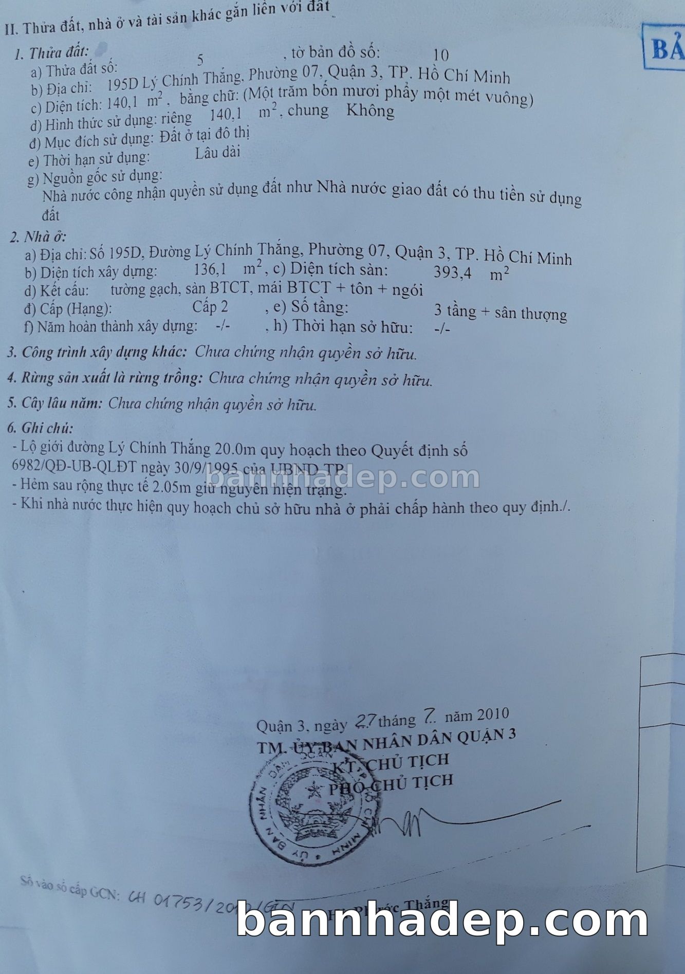 BÁN NHÀ Mặt tiền Số 195D Lý Chính Thắng phường 07 quận 3 TP. Hồ Chí Minh – GẦN CÔNG VIÊN GIẢI TRÍ – GIÁ TỐT Cần bán gấp nhà Mặt tiền tại Số 195D Lý Chính Thắng phường 07 quận 3 TP. Hồ Chí Minh – tiềm năng kinh doanh cao. Thông tin chi tiết: • Địa chỉ: Số 195D Lý Chính Thắng phường 07 quận 3 TP. Hồ Chí Minh • Diện tích: như trong sổ, không gian lý tưởng • Vị trí: Mặt tiền đường Lý Chính Thắng, gần trung tâm thương mại lớn, khu vực sầm uất, tiềm năng kinh doanh cao • Pháp lý: Sổ hồng riêng, không tranh chấp, sẵn sàng giao dịch • Giá bán: Thoả Thuận (còn thương lượng với khách thiện chí) Lợi thế đặc biệt: • Vị trí trung tâm Quận 3 • Giao thông thuận tiện, kết nối các quận trung tâm • Phù hợp kinh doanh dài hạn, ổn định • Khu vực sầm uất, tiềm năng kinh doanh tốt