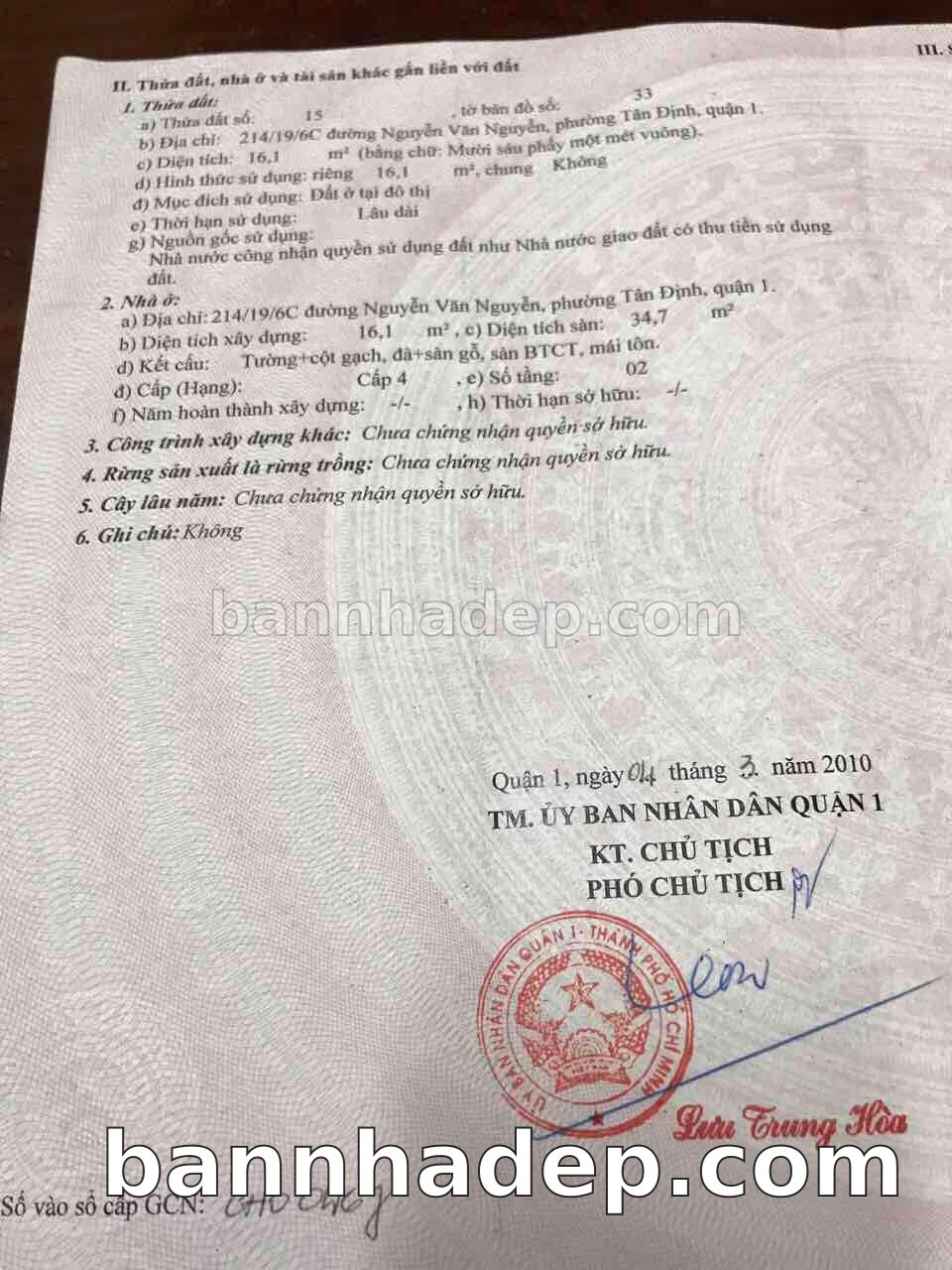 BÁN NHÀ Đường hẻm Số 214/19/6C Nguyễn Văn Nguyễn phường Tân Định quận 1 TP. Hồ Chí Minh – GẦN CÔNG VIÊN GIẢI TRÍ – GIÁ TỐT Cần bán gấp nhà Đường hẻm tại Số 214/19/6C Nguyễn Văn Nguyễn phường Tân Định quận 1 TP. Hồ Chí Minh – tiềm năng kinh doanh cao. Thông tin chi tiết: • Địa chỉ: Số 214/19/6C Nguyễn Văn Nguyễn phường Tân Định quận 1 TP. Hồ Chí Minh • Diện tích: như trong sổ, không gian lý tưởng • Vị trí: Đường hẻm đường Nguyễn Văn Nguyễn, gần trung tâm thương mại lớn, khu vực sầm uất, tiềm năng kinh doanh cao • Pháp lý: Sổ hồng riêng, không tranh chấp, sẵn sàng giao dịch • Giá bán: Thoả Thuận (còn thương lượng với khách thiện chí) Lợi thế đặc biệt: • Vị trí trung tâm Quận 1 • Giao thông thuận tiện, kết nối các quận trung tâm • Phù hợp kinh doanh dài hạn, ổn định • Khu vực sầm uất, tiềm năng kinh doanh tốt