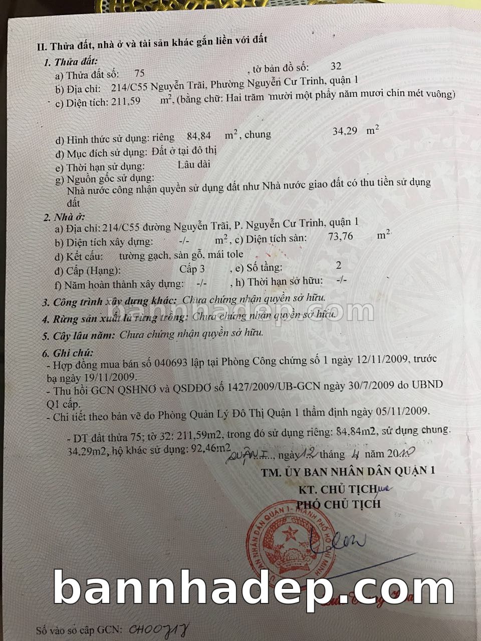 BÁN NHÀ Đường hẻm Số 214/C55 Nguyễn Trãi phường Nguyễn Cư Trinh quận 1 TP. Hồ Chí Minh – GẦN CÔNG VIÊN GIẢI TRÍ – GIÁ TỐT Cần bán gấp nhà Đường hẻm tại Số 214/C55 Nguyễn Trãi phường Nguyễn Cư Trinh quận 1 TP. Hồ Chí Minh – tiềm năng kinh doanh cao. Thông tin chi tiết: • Địa chỉ: Số 214/C55 Nguyễn Trãi phường Nguyễn Cư Trinh quận 1 TP. Hồ Chí Minh • Diện tích: như trong sổ, không gian lý tưởng • Vị trí: Đường hẻm đường Nguyễn Trãi, gần trung tâm thương mại lớn, khu vực sầm uất, tiềm năng kinh doanh cao • Pháp lý: Sổ hồng riêng, không tranh chấp, sẵn sàng giao dịch • Giá bán: Thoả Thuận (còn thương lượng với khách thiện chí) Lợi thế đặc biệt: • Vị trí trung tâm Quận 1 • Giao thông thuận tiện, kết nối các quận trung tâm • Phù hợp kinh doanh dài hạn, ổn định • Khu vực sầm uất, tiềm năng kinh doanh tốt