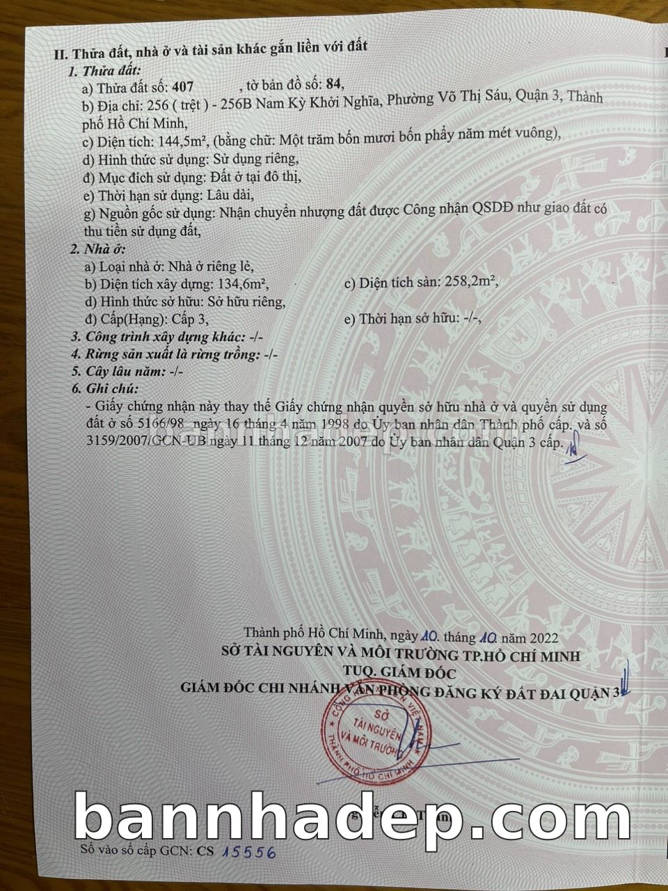 BÁN NHÀ MẶT TIỀN Số 256a+256b Nam Kỳ Khởi Nghĩa Phường Võ Thị Sáu Quận 3 TP. Hồ Chí Minh – GẦN BỆNH VIỆN QUỐC TẾ – GIÁ CỰC TỐT 95 TỶ Cần bán nhà mặt tiền tại Số 256a+256b Nam Kỳ Khởi Nghĩa Phường Võ Thị Sáu Quận 3 TP. Hồ Chí Minh. Thông tin chi tiết: • Địa chỉ: Số 256a+256b Nam Kỳ Khởi Nghĩa Phường Võ Thị Sáu Quận 3 TP. Hồ Chí Minh • Diện tích: 11.0m x 16.0m, mặt tiền rộng • Vị trí: Mặt tiền đường Nam Kỳ Khởi Nghĩa, gần trường học quốc tế, khu vực đông dân cư, tiềm năng kinh doanh tốt • Pháp lý: Sổ hồng riêng, quy hoạch rõ ràng, sẵn sàng sang tên • Giá bán: 95 Tỷ (giá tốt cho khách thiện chí) Điểm nổi bật: • Phù hợp kinh doanh dài hạn, ổn định • Giao thông thuận tiện, kết nối các quận trung tâm • Phù hợp kinh doanh đa dạng ngành nghề • Mặt tiền rộng, giá trị khai thác thương mại cao