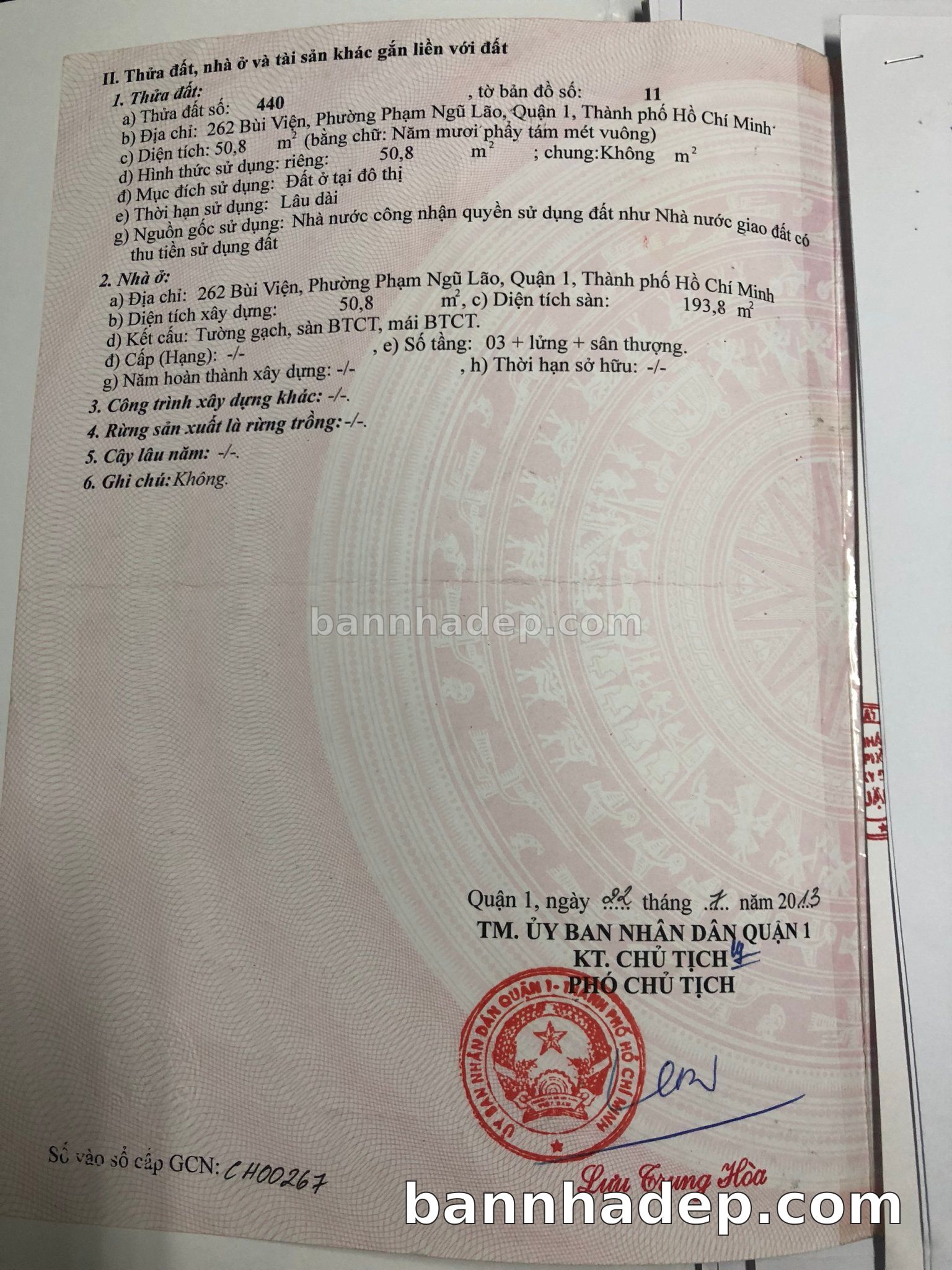 BÁN NHÀ Mặt tiền Số 262 Bùi Viện phường Phạm Ngũ Lão quận 1 TP. Hồ Chí Minh – GẦN CÔNG VIÊN GIẢI TRÍ – GIÁ TỐT Cần bán gấp nhà Mặt tiền tại Số 262 Bùi Viện phường Phạm Ngũ Lão quận 1 TP. Hồ Chí Minh – tiềm năng kinh doanh cao. Thông tin chi tiết: • Địa chỉ: Số 262 Bùi Viện phường Phạm Ngũ Lão quận 1 TP. Hồ Chí Minh • Diện tích: như trong sổ, không gian lý tưởng • Vị trí: Mặt tiền đường Bùi Viện, gần trung tâm thương mại lớn, khu vực sầm uất, tiềm năng kinh doanh cao • Pháp lý: Sổ hồng riêng, không tranh chấp, sẵn sàng giao dịch • Giá bán: Thoả Thuận (còn thương lượng với khách thiện chí) Lợi thế đặc biệt: • Vị trí trung tâm Quận 1 • Giao thông thuận tiện, kết nối các quận trung tâm • Phù hợp kinh doanh dài hạn, ổn định • Khu vực sầm uất, tiềm năng kinh doanh tốt