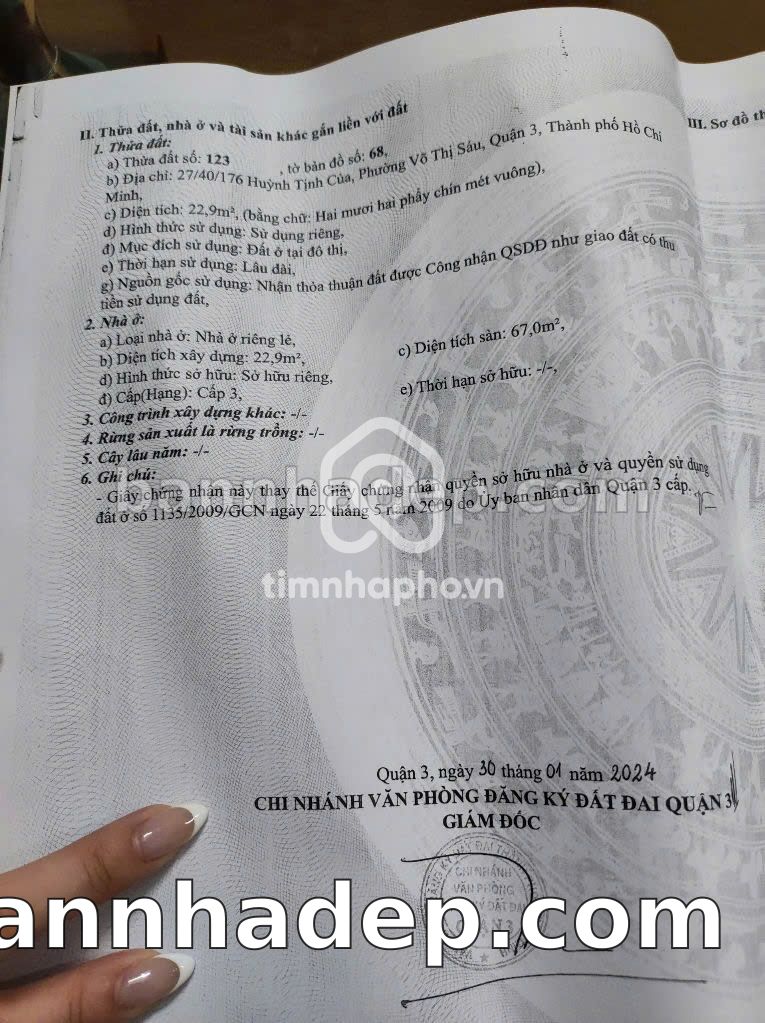 BÁN NHÀ MẶT TIỀN Số 27/40/176Thửa: 123Tờ: 22 Huỳnh Tịnh Của Phường Võ Thị Sáu Quận 3 TP. Hồ Chí Minh – GẦN SIÊU THỊ LỚN – GIÁ CỰC TỐT 4,5 TỶ Cần bán nhà mặt tiền tại Số 27/40/176Thửa: 123Tờ: 22 Huỳnh Tịnh Của Phường Võ Thị Sáu Quận 3 TP. Hồ Chí Minh. Thông tin chi tiết: • Địa chỉ: Số 27/40/176Thửa: 123Tờ: 22 Huỳnh Tịnh Của Phường Võ Thị Sáu Quận 3 TP. Hồ Chí Minh • Diện tích: 3.0m x 8.0m, không gian lý tưởng • Vị trí: Mặt tiền đường Huỳnh Tịnh Của, gần bệnh viện quốc tế, khu vực đông dân cư, tiềm năng kinh doanh tốt • Pháp lý: Sổ hồng riêng, công chứng sang tên trong ngày • Giá bán: 4,5 Tỷ (giá tốt cho khách thiện chí) Lợi thế đặc biệt: • Gần các tiện ích quan trọng: chợ, trường học, bệnh viện, công viên • Giao thông thuận tiện, kết nối các quận trung tâm • Mặt tiền rộng, giá trị khai thác thương mại cao • Khu vực sầm uất, lưu lượng khách hàng lớn