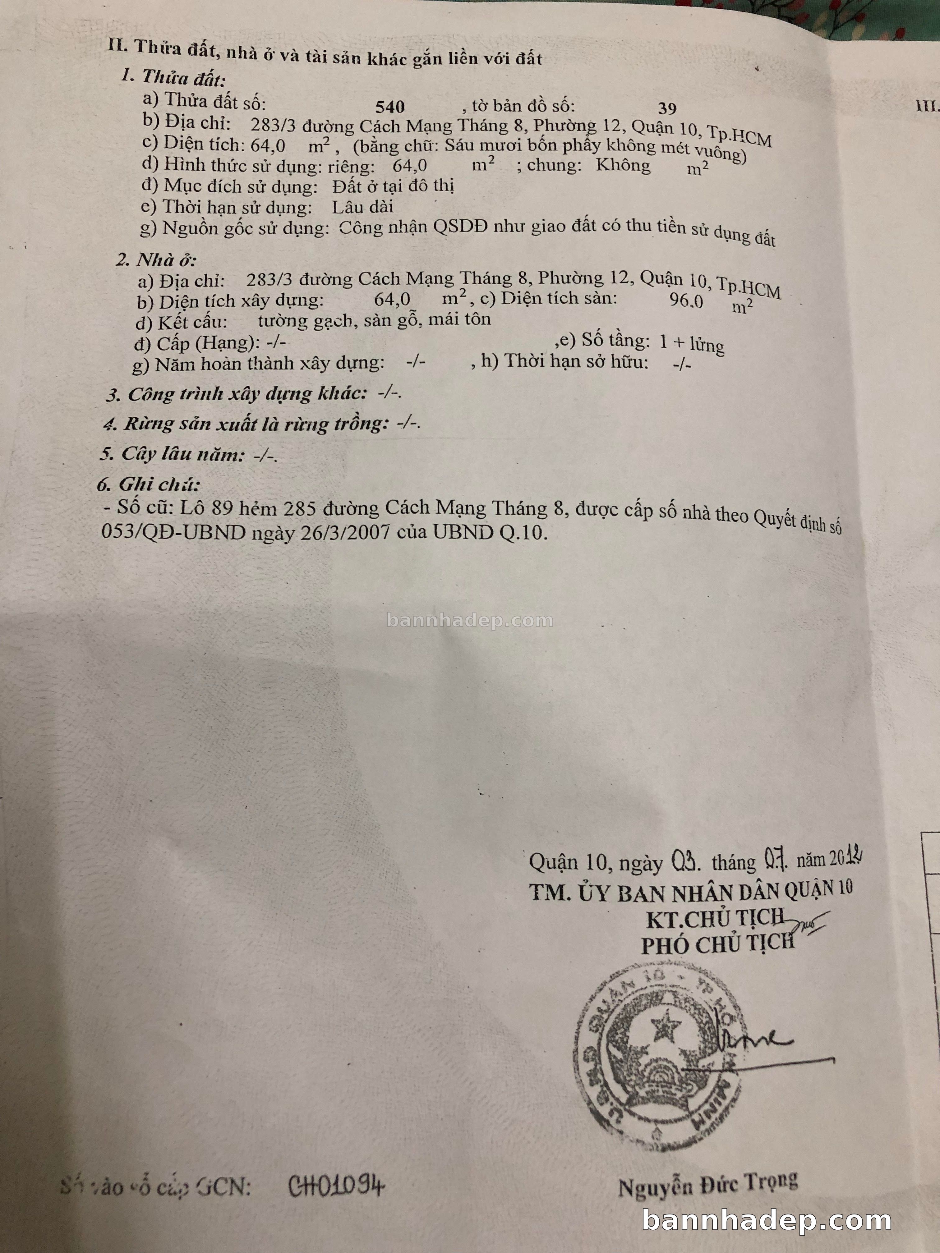 Bán nhà 283/3 Cách Mạng Tháng 8 phường 01 quận 10