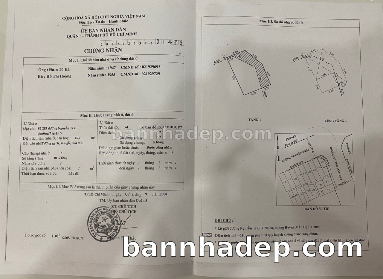 BÁN NHÀ MẶT TIỀN Số 283 Nguyễn Trãi Phường 7 Quận 5 TP. Hồ Chí Minh – GẦN SIÊU THỊ LỚN – GIÁ CỰC TỐT 33 TỶ Cần bán gấp nhà mặt tiền kinh doanh tại Số 283 Nguyễn Trãi Phường 7 Quận 5 TP. Hồ Chí Minh. Thông tin chi tiết: • Địa chỉ: Số 283 Nguyễn Trãi Phường 7 Quận 5 TP. Hồ Chí Minh • Diện tích: 6.3m x 9.0m, mặt tiền rộng • Vị trí: Mặt tiền đường Nguyễn Trãi sầm uất, gần bệnh viện quốc tế, khu vực dân cư đông đúc, lưu lượng xe cộ lớn – cực kỳ thích hợp kinh doanh mọi ngành nghề: cửa hàng tiện lợi, quán ăn, tiệm giặt là, văn phòng, showroom • Pháp lý: Sổ hồng riêng, quy hoạch rõ ràng, sẵn sàng sang tên • Giá bán: 33 Tỷ (giá tốt nhất khu vực, có thể thương lượng) Điểm mạnh: • Giao thông thuận tiện, kết nối các quận trung tâm • Khu vực sầm uất, tiềm năng kinh doanh tốt • Phù hợp kinh doanh đa dạng ngành nghề • Phù hợp kinh doanh dài hạn, ổn định