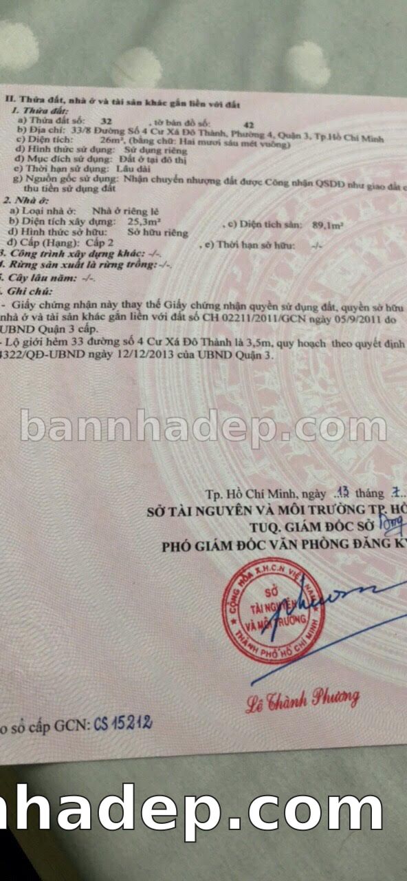 BÁN NHÀ Đường hẻm Số 33/8 đường Số 4, Cư xá Đô Thành phường 04 quận 3 TP. Hồ Chí Minh – GẦN CÔNG VIÊN GIẢI TRÍ – GIÁ TỐT Cần bán gấp nhà Đường hẻm tại Số 33/8 đường Số 4, Cư xá Đô Thành phường 04 quận 3 TP. Hồ Chí Minh – tiềm năng kinh doanh cao. Thông tin chi tiết: • Địa chỉ: Số 33/8 đường Số 4, Cư xá Đô Thành phường 04 quận 3 TP. Hồ Chí Minh • Diện tích: như trong sổ, không gian lý tưởng • Vị trí: Đường hẻm đường đường Số 4, Cư xá Đô Thành, gần trung tâm thương mại lớn, khu vực sầm uất, tiềm năng kinh doanh cao • Pháp lý: Sổ hồng riêng, không tranh chấp, sẵn sàng giao dịch • Giá bán: Thoả Thuận (còn thương lượng với khách thiện chí) Lợi thế đặc biệt: • Vị trí trung tâm Quận 3 • Giao thông thuận tiện, kết nối các quận trung tâm • Phù hợp kinh doanh dài hạn, ổn định • Khu vực sầm uất, tiềm năng kinh doanh tốt