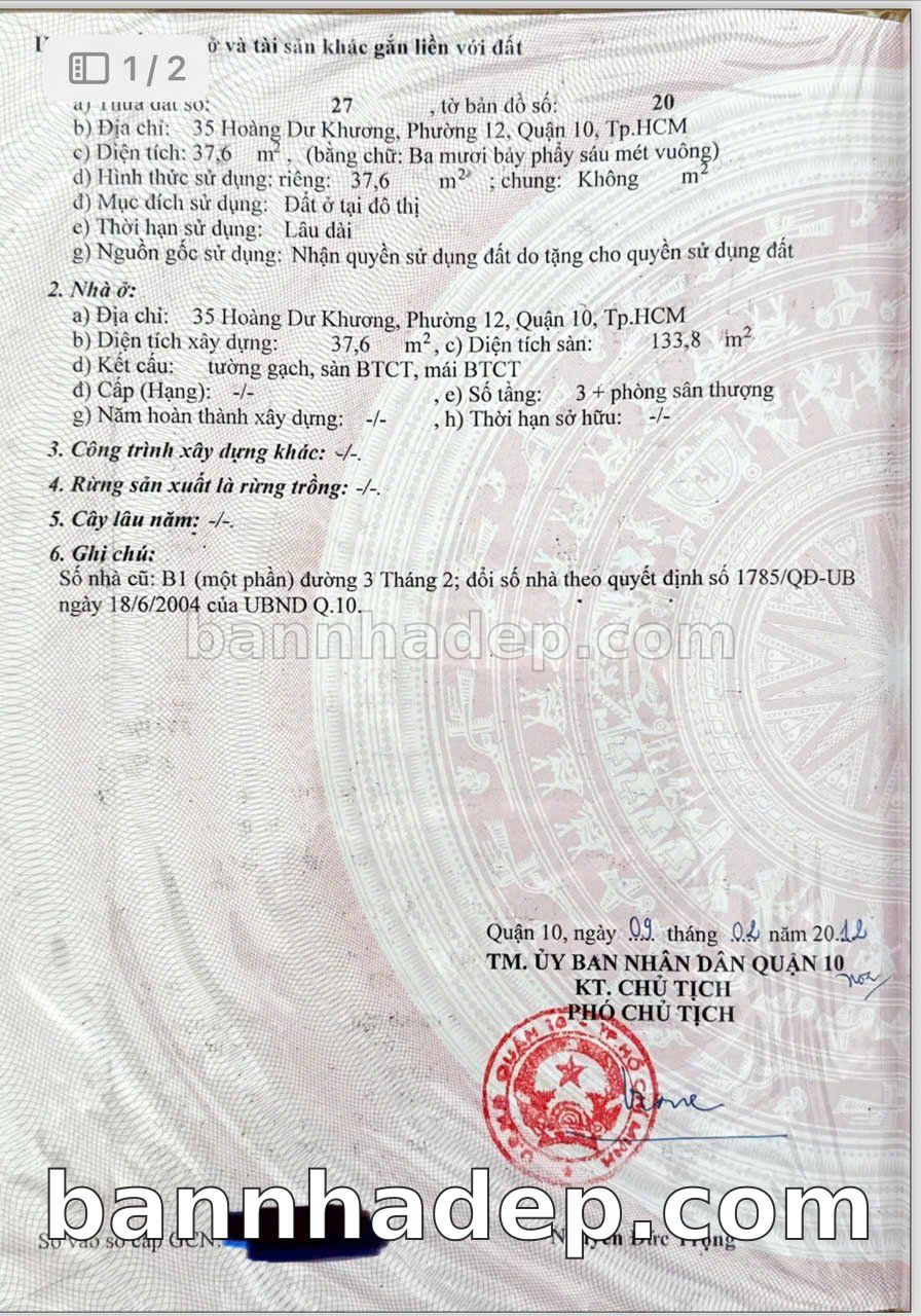 BÁN NHÀ MẶT TIỀN Số 35 Hoàng Dư Khương Phường 12 Quận 10 TP. Hồ Chí Minh – GẦN TRUNG TÂM THƯƠNG MẠI LỚN – GIÁ TỐT 22 TỶ Cần bán gấp nhà mặt tiền kinh doanh cực đẹp tại Số 35 Hoàng Dư Khương Phường 12 Quận 10 TP. Hồ Chí Minh. Thông tin chi tiết: • Địa chỉ: Số 35 Hoàng Dư Khương Phường 12 Quận 10 TP. Hồ Chí Minh • Diện tích: 4.0m x 11.0m, đất vuông vức • Vị trí: Mặt tiền đường Hoàng Dư Khương, gần bệnh viện, khu vực dân cư đông đúc • Pháp lý: Sổ hồng riêng, quy hoạch rõ ràng, sẵn sàng sang tên • Giá bán: 22 Tỷ (giá tốt nhất khu vực, có thể thương lượng) Điểm mạnh: • Vị trí đắc địa, tiềm năng sinh lời cao • Giao thông thuận tiện, kết nối các quận trung tâm • Mặt tiền rộng, giá trị khai thác thương mại cao • Khu vực phát triển, tiềm năng tăng trưởng cao