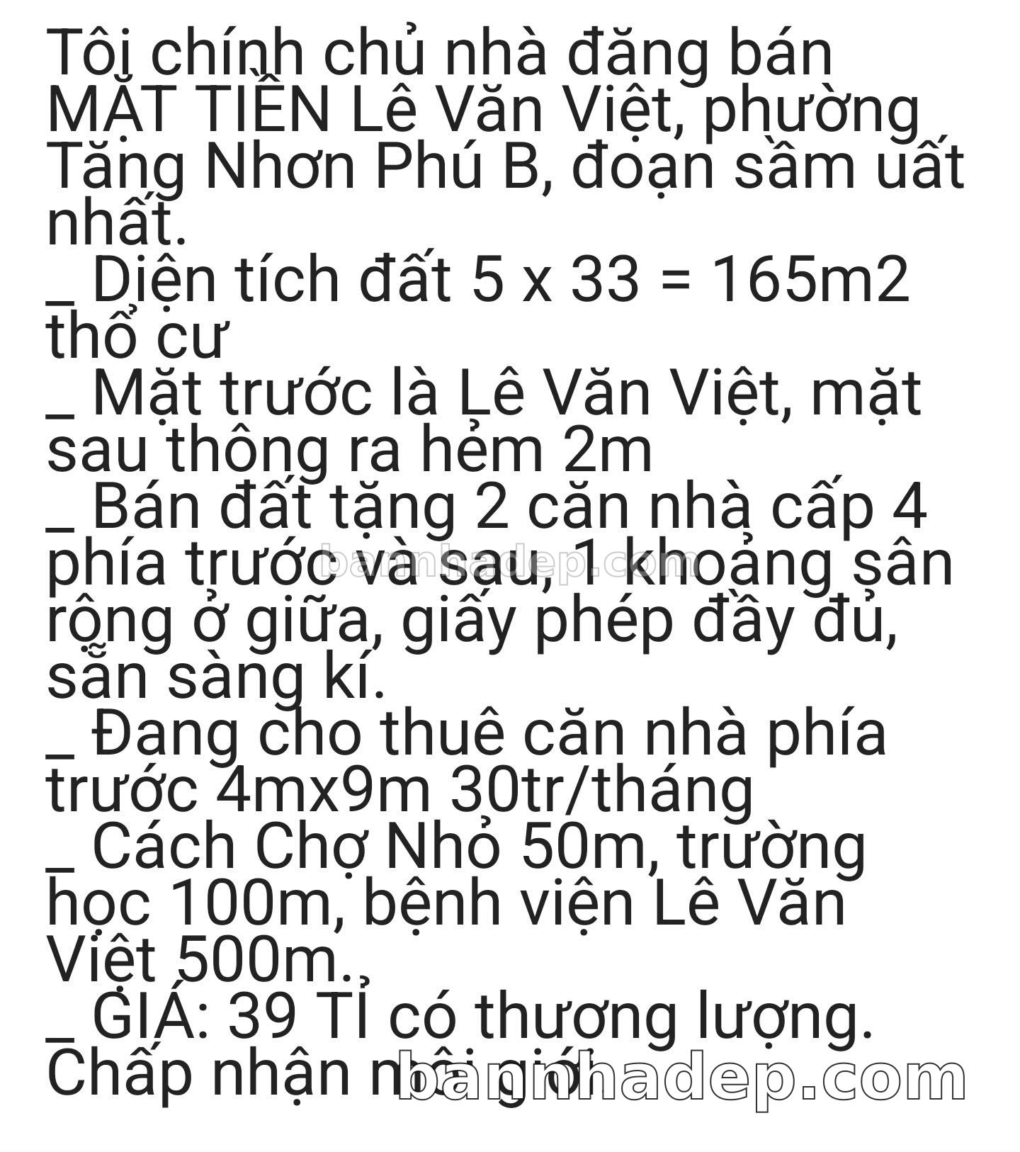 BÁN NHÀ MẶT TIỀN Số 352 Lê Văn Việt Phường Tăng Nhơn Phú B Thủ Đức TP. Hồ Chí Minh – GẦN TRUNG TÂM THƯƠNG MẠI – GIÁ TỐT 39 TỶ Bán gấp nhà mặt tiền tại Số 352 Lê Văn Việt Phường Tăng Nhơn Phú B Thủ Đức TP. Hồ Chí Minh. Thông tin chi tiết: • Địa chỉ: Số 352 Lê Văn Việt Phường Tăng Nhơn Phú B Thủ Đức TP. Hồ Chí Minh • Diện tích: 5.0m x 33.0m, không gian lý tưởng • Vị trí: Mặt tiền đường Lê Văn Việt, đối diện trường học, khu vực dân cư đông đúc • Pháp lý: Sổ hồng riêng, thổ cư 100%, sẵn sàng sang tên • Giá bán: 39 Tỷ (giá hấp dẫn, thương lượng với khách thiện chí) Ưu thế vượt trội: • Khu vực sầm uất, tiềm năng kinh doanh tốt • Giao thông thuận tiện, kết nối các quận trung tâm • Khu vực phát triển, tiềm năng tăng trưởng cao • Khu vực sầm uất, lưu lượng khách hàng lớn