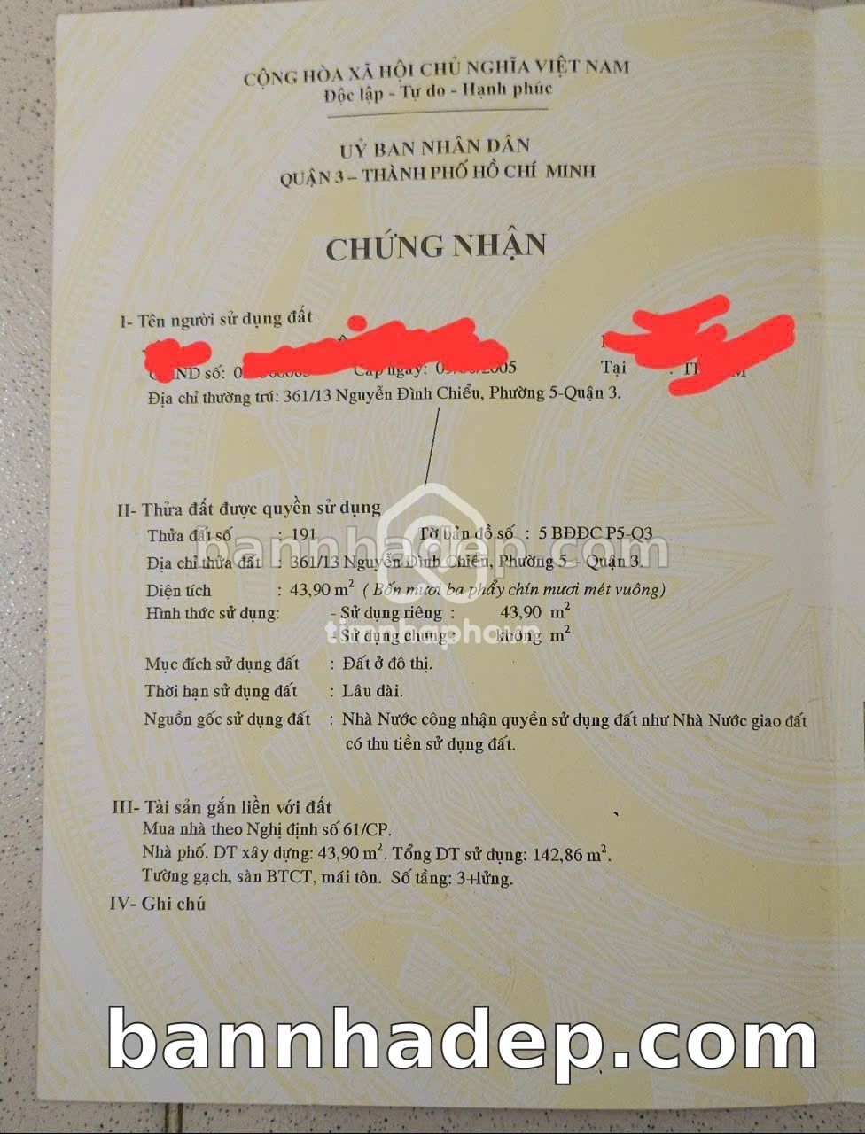 BÁN NHÀ MẶT TIỀN Số 361/13 Nguyễn Đình Chiểu Phường 5 Quận 3 TP. Hồ Chí Minh – ĐỐI DIỆN TRƯỜNG HỌC – GIÁ CỰC TỐT 10 TỶ Bán nhà mặt tiền tại Số 361/13 Nguyễn Đình Chiểu Phường 5 Quận 3 TP. Hồ Chí Minh. Thông tin chi tiết: • Địa chỉ: Số 361/13 Nguyễn Đình Chiểu Phường 5 Quận 3 TP. Hồ Chí Minh • Diện tích: 4.3m x 10.0m, mặt tiền rộng • Vị trí: Mặt tiền đường Nguyễn Đình Chiểu, gần trung tâm thương mại lớn, khu vực dân cư đông đúc • Pháp lý: Sổ hồng riêng, thổ cư 100%, sẵn sàng sang tên • Giá bán: 10 Tỷ (có thể thương lượng) Điểm mạnh: • Khu vực sầm uất, tiềm năng kinh doanh tốt • Phù hợp kinh doanh dài hạn, ổn định • Khu vực phát triển, tiềm năng tăng trưởng cao • Khu vực sầm uất, lưu lượng khách hàng lớn