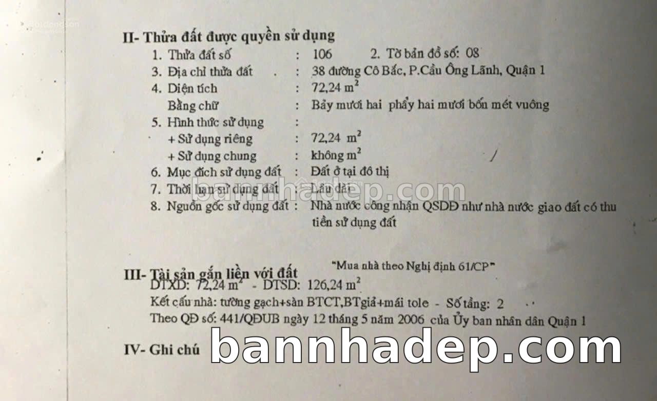 BÁN NHÀ MẶT TIỀN Số 38 Cô Bắc Phường Cầu Ông Lãnh Quận 1 TP. Hồ Chí Minh – GẦN CÔNG VIÊN GIẢI TRÍ – GIÁ CỰC TỐT 35 TỶ Bán nhà mặt tiền tại Số 38 Cô Bắc Phường Cầu Ông Lãnh Quận 1 TP. Hồ Chí Minh. Thông tin chi tiết: • Địa chỉ: Số 38 Cô Bắc Phường Cầu Ông Lãnh Quận 1 TP. Hồ Chí Minh • Diện tích: 4.2m x 18.0m, mặt tiền rộng • Vị trí: Mặt tiền đường Cô Bắc sầm uất, gần công viên, khu vực dân cư đông đúc, lưu lượng xe cộ lớn – cực kỳ thích hợp kinh doanh mọi ngành nghề: cửa hàng tiện lợi, showroom, café, nha khoa, spa, văn phòng đại diện • Pháp lý: Sổ hồng riêng, quy hoạch rõ ràng, sẵn sàng sang tên • Giá bán: 35 Tỷ (giá tốt cho khách thiện chí) Điểm mạnh: • Khu vực sầm uất, tiềm năng kinh doanh tốt • Gần các tiện ích quan trọng: chợ, trường học, bệnh viện, công viên • Khu vực phát triển, tiềm năng tăng trưởng cao • Vị trí đắc địa, tiềm năng sinh lời cao