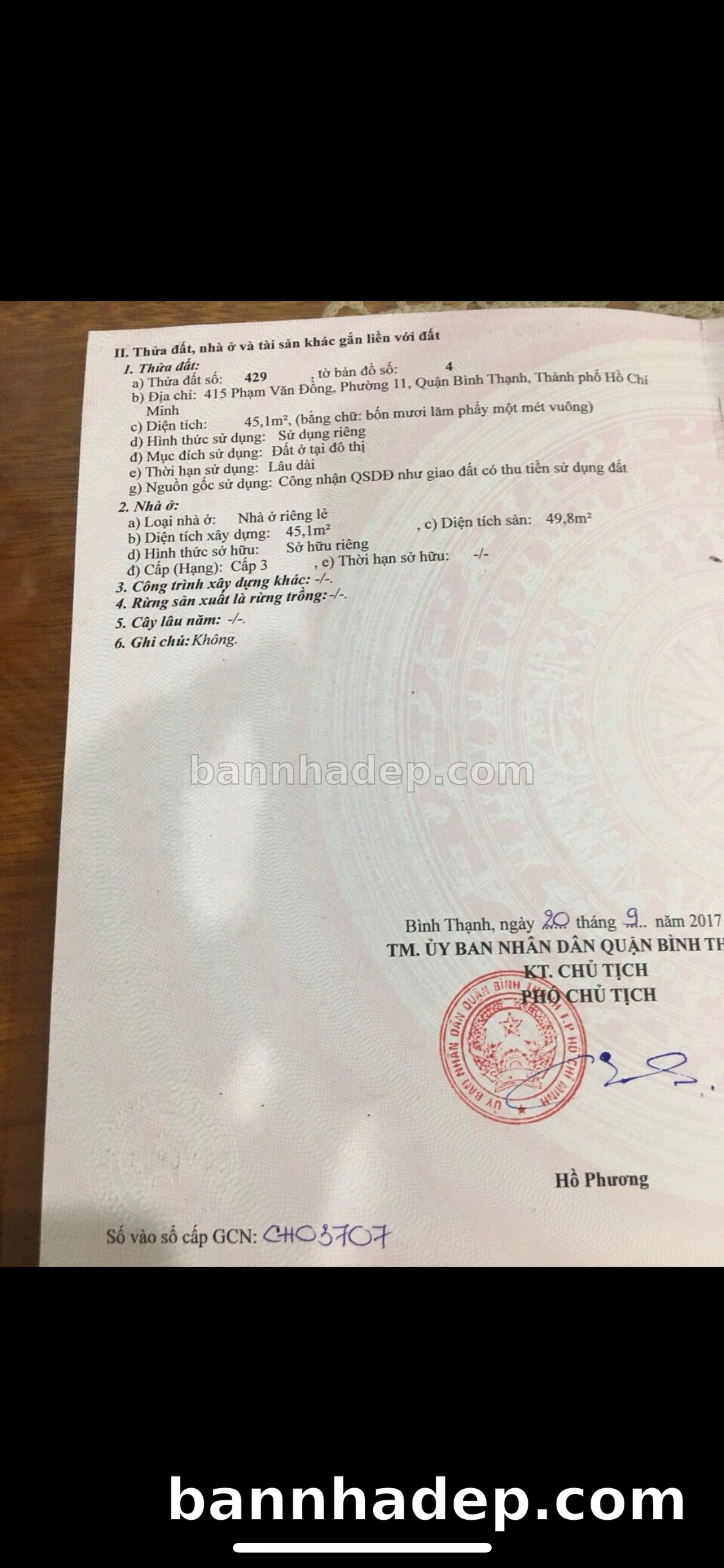 BÁN NHÀ Mặt tiền Số 415 Phạm Văn Đồng phường 01 quận Bình Thạnh TP. Hồ Chí Minh – GẦN CÔNG VIÊN GIẢI TRÍ – GIÁ TỐT Cần bán gấp nhà Mặt tiền tại Số 415 Phạm Văn Đồng phường 01 quận Bình Thạnh TP. Hồ Chí Minh – tiềm năng kinh doanh cao. Thông tin chi tiết: • Địa chỉ: Số 415 Phạm Văn Đồng phường 01 quận Bình Thạnh TP. Hồ Chí Minh • Diện tích: như trong sổ, không gian lý tưởng • Vị trí: Mặt tiền đường Phạm Văn Đồng, gần trung tâm thương mại lớn, khu vực sầm uất, tiềm năng kinh doanh cao • Pháp lý: Sổ hồng riêng, không tranh chấp, sẵn sàng giao dịch • Giá bán: Thoả Thuận (còn thương lượng với khách thiện chí) Lợi thế đặc biệt: • Vị trí trung tâm Quận Bình Thạnh • Giao thông thuận tiện, kết nối các quận trung tâm • Phù hợp kinh doanh dài hạn, ổn định • Khu vực sầm uất, tiềm năng kinh doanh tốt