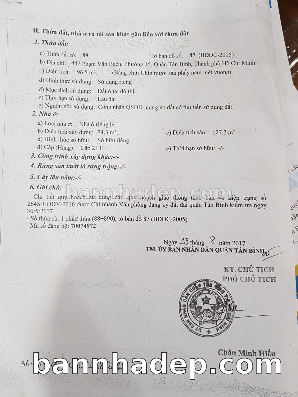 BÁN NHÀ Mặt tiền Số 447 Phạm Văn Bạch phường 01 quận Tân Bình TP. Hồ Chí Minh – GẦN CÔNG VIÊN GIẢI TRÍ – GIÁ TỐT Cần bán gấp nhà Mặt tiền tại Số 447 Phạm Văn Bạch phường 01 quận Tân Bình TP. Hồ Chí Minh – tiềm năng kinh doanh cao. Thông tin chi tiết: • Địa chỉ: Số 447 Phạm Văn Bạch phường 01 quận Tân Bình TP. Hồ Chí Minh • Diện tích: như trong sổ, không gian lý tưởng • Vị trí: Mặt tiền đường Phạm Văn Bạch, gần trung tâm thương mại lớn, khu vực sầm uất, tiềm năng kinh doanh cao • Pháp lý: Sổ hồng riêng, không tranh chấp, sẵn sàng giao dịch • Giá bán: Thoả Thuận (còn thương lượng với khách thiện chí) Lợi thế đặc biệt: • Vị trí trung tâm Quận Tân Bình • Giao thông thuận tiện, kết nối các quận trung tâm • Phù hợp kinh doanh dài hạn, ổn định • Khu vực sầm uất, tiềm năng kinh doanh tốt