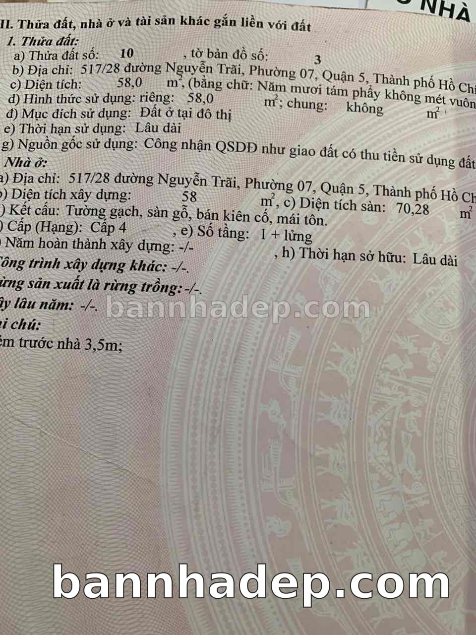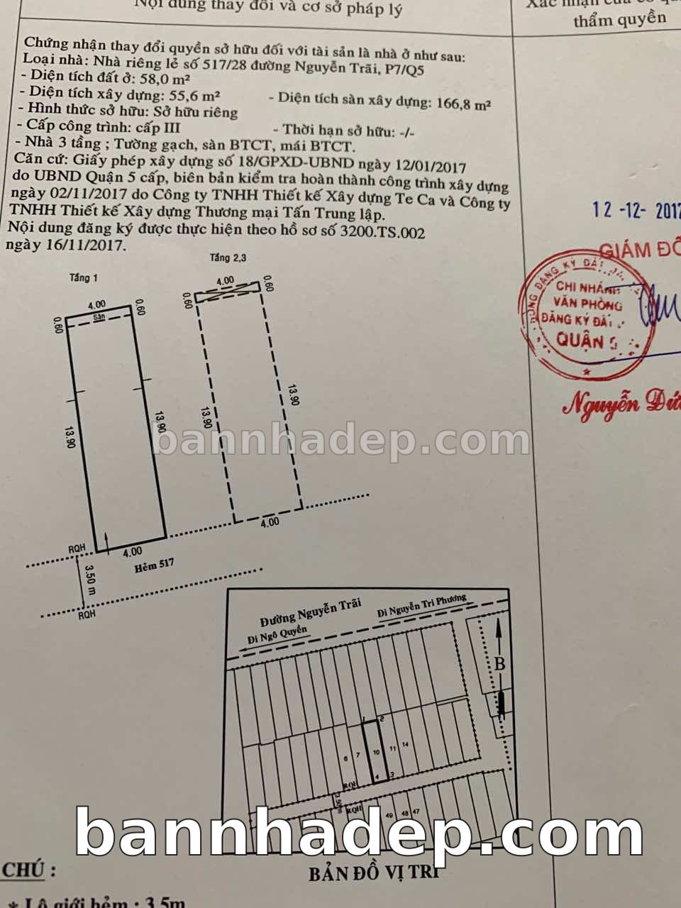 BÁN NHÀ Đường hẻm Số 517/28 Nguyễn Trãi phường 07 quận 5 TP. Hồ Chí Minh – GẦN CÔNG VIÊN GIẢI TRÍ – GIÁ TỐT Cần bán gấp nhà Đường hẻm tại Số 517/28 Nguyễn Trãi phường 07 quận 5 TP. Hồ Chí Minh – tiềm năng kinh doanh cao. Thông tin chi tiết: • Địa chỉ: Số 517/28 Nguyễn Trãi phường 07 quận 5 TP. Hồ Chí Minh • Diện tích: như trong sổ, không gian lý tưởng • Vị trí: Đường hẻm đường Nguyễn Trãi, gần trung tâm thương mại lớn, khu vực sầm uất, tiềm năng kinh doanh cao • Pháp lý: Sổ hồng riêng, không tranh chấp, sẵn sàng giao dịch • Giá bán: Thoả Thuận (còn thương lượng với khách thiện chí) Lợi thế đặc biệt: • Vị trí trung tâm Quận 5 • Giao thông thuận tiện, kết nối các quận trung tâm • Phù hợp kinh doanh dài hạn, ổn định • Khu vực sầm uất, tiềm năng kinh doanh tốt