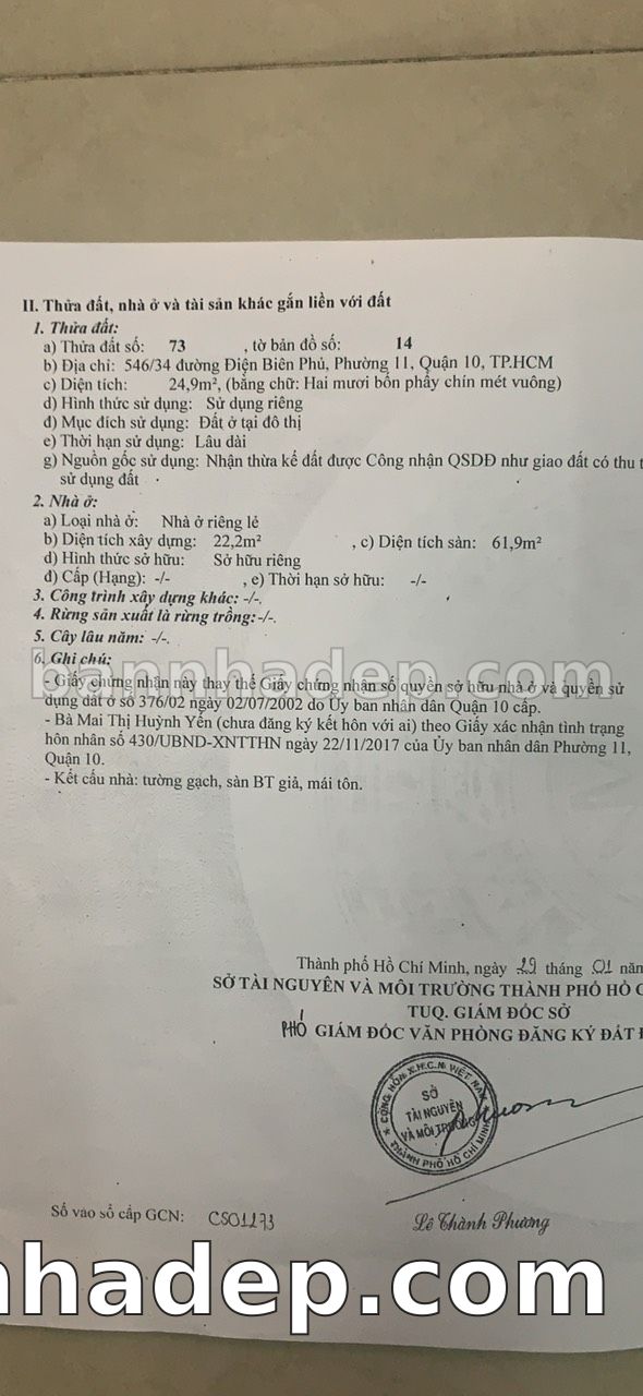 Bán nhà 546/34 Điện Biên Phủ phường 01 quận 10