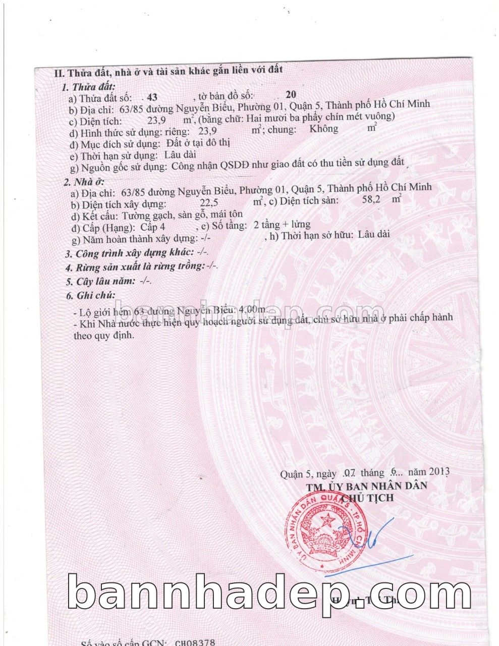 BÁN NHÀ Đường hẻm Số 63/85 Nguyễn Biểu phường 01 quận 5 TP. Hồ Chí Minh – GẦN CÔNG VIÊN GIẢI TRÍ – GIÁ TỐT Cần bán gấp nhà Đường hẻm tại Số 63/85 Nguyễn Biểu phường 01 quận 5 TP. Hồ Chí Minh – tiềm năng kinh doanh cao. Thông tin chi tiết: • Địa chỉ: Số 63/85 Nguyễn Biểu phường 01 quận 5 TP. Hồ Chí Minh • Diện tích: như trong sổ, không gian lý tưởng • Vị trí: Đường hẻm đường Nguyễn Biểu, gần trung tâm thương mại lớn, khu vực sầm uất, tiềm năng kinh doanh cao • Pháp lý: Sổ hồng riêng, không tranh chấp, sẵn sàng giao dịch • Giá bán: Thoả Thuận (còn thương lượng với khách thiện chí) Lợi thế đặc biệt: • Vị trí trung tâm Quận 5 • Giao thông thuận tiện, kết nối các quận trung tâm • Phù hợp kinh doanh dài hạn, ổn định • Khu vực sầm uất, tiềm năng kinh doanh tốt