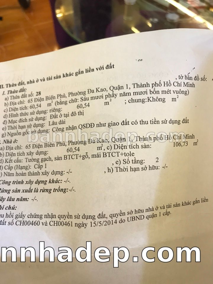 BÁN NHÀ Mặt tiền Số 65 Điện Biên Phủ phường Đa Kao quận 1 TP. Hồ Chí Minh – GẦN CÔNG VIÊN GIẢI TRÍ – GIÁ TỐT Cần bán gấp nhà Mặt tiền tại Số 65 Điện Biên Phủ phường Đa Kao quận 1 TP. Hồ Chí Minh – tiềm năng kinh doanh cao. Thông tin chi tiết: • Địa chỉ: Số 65 Điện Biên Phủ phường Đa Kao quận 1 TP. Hồ Chí Minh • Diện tích: như trong sổ, không gian lý tưởng • Vị trí: Mặt tiền đường Điện Biên Phủ, gần trung tâm thương mại lớn, khu vực sầm uất, tiềm năng kinh doanh cao • Pháp lý: Sổ hồng riêng, không tranh chấp, sẵn sàng giao dịch • Giá bán: Thoả Thuận (còn thương lượng với khách thiện chí) Lợi thế đặc biệt: • Vị trí trung tâm Quận 1 • Giao thông thuận tiện, kết nối các quận trung tâm • Phù hợp kinh doanh dài hạn, ổn định • Khu vực sầm uất, tiềm năng kinh doanh tốt