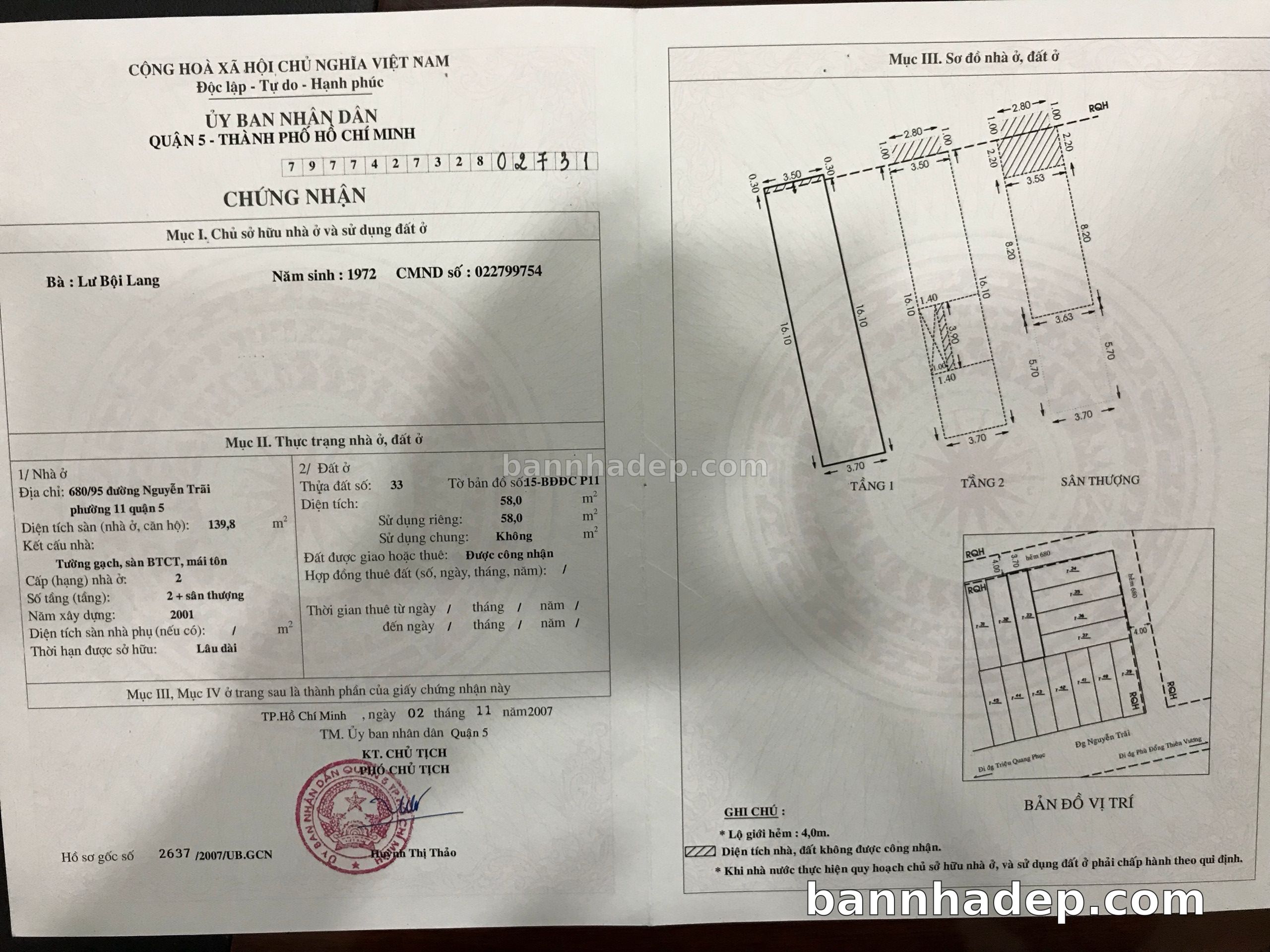 BÁN NHÀ Đường hẻm Số 680/95 Nguyễn Trãi phường 01 quận 5 TP. Hồ Chí Minh – GẦN CÔNG VIÊN GIẢI TRÍ – GIÁ TỐT Cần bán gấp nhà Đường hẻm tại Số 680/95 Nguyễn Trãi phường 01 quận 5 TP. Hồ Chí Minh – tiềm năng kinh doanh cao. Thông tin chi tiết: • Địa chỉ: Số 680/95 Nguyễn Trãi phường 01 quận 5 TP. Hồ Chí Minh • Diện tích: như trong sổ, không gian lý tưởng • Vị trí: Đường hẻm đường Nguyễn Trãi, gần trung tâm thương mại lớn, khu vực sầm uất, tiềm năng kinh doanh cao • Pháp lý: Sổ hồng riêng, không tranh chấp, sẵn sàng giao dịch • Giá bán: Thoả Thuận (còn thương lượng với khách thiện chí) Lợi thế đặc biệt: • Vị trí trung tâm Quận 5 • Giao thông thuận tiện, kết nối các quận trung tâm • Phù hợp kinh doanh dài hạn, ổn định • Khu vực sầm uất, tiềm năng kinh doanh tốt