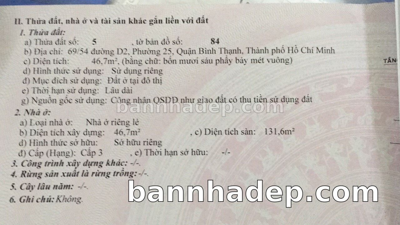 BÁN NHÀ Mặt tiền Số 69/54 Đường D2 phường 02 quận Bình Thạnh TP. Hồ Chí Minh – GẦN CÔNG VIÊN GIẢI TRÍ – GIÁ TỐT Cần bán gấp nhà Mặt tiền tại Số 69/54 Đường D2 phường 02 quận Bình Thạnh TP. Hồ Chí Minh – tiềm năng kinh doanh cao. Thông tin chi tiết: • Địa chỉ: Số 69/54 Đường D2 phường 02 quận Bình Thạnh TP. Hồ Chí Minh • Diện tích: như trong sổ, không gian lý tưởng • Vị trí: Mặt tiền đường Đường D2, gần trung tâm thương mại lớn, khu vực sầm uất, tiềm năng kinh doanh cao • Pháp lý: Sổ hồng riêng, không tranh chấp, sẵn sàng giao dịch • Giá bán: Thoả Thuận (còn thương lượng với khách thiện chí) Lợi thế đặc biệt: • Vị trí trung tâm Quận Bình Thạnh • Giao thông thuận tiện, kết nối các quận trung tâm • Phù hợp kinh doanh dài hạn, ổn định • Khu vực sầm uất, tiềm năng kinh doanh tốt