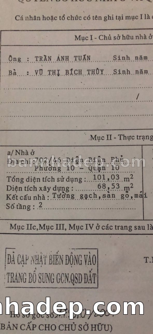 BÁN NHÀ Đường hẻm Số 702/46 Điện Biên Phủ phường 01 quận 10 TP. Hồ Chí Minh – GẦN CÔNG VIÊN GIẢI TRÍ – GIÁ TỐT Cần bán gấp nhà Đường hẻm tại Số 702/46 Điện Biên Phủ phường 01 quận 10 TP. Hồ Chí Minh – tiềm năng kinh doanh cao. Thông tin chi tiết: • Địa chỉ: Số 702/46 Điện Biên Phủ phường 01 quận 10 TP. Hồ Chí Minh • Diện tích: như trong sổ, không gian lý tưởng • Vị trí: Đường hẻm đường Điện Biên Phủ, gần trung tâm thương mại lớn, khu vực sầm uất, tiềm năng kinh doanh cao • Pháp lý: Sổ hồng riêng, không tranh chấp, sẵn sàng giao dịch • Giá bán: Thoả Thuận (còn thương lượng với khách thiện chí) Lợi thế đặc biệt: • Vị trí trung tâm Quận 10 • Giao thông thuận tiện, kết nối các quận trung tâm • Phù hợp kinh doanh dài hạn, ổn định • Khu vực sầm uất, tiềm năng kinh doanh tốt