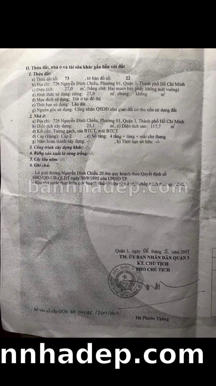 BÁN NHÀ Mặt tiền Số 726 Nguyễn Đình Chiểu phường 01 quận 3 TP. Hồ Chí Minh – GẦN CÔNG VIÊN GIẢI TRÍ – GIÁ TỐT Cần bán gấp nhà Mặt tiền tại Số 726 Nguyễn Đình Chiểu phường 01 quận 3 TP. Hồ Chí Minh – tiềm năng kinh doanh cao. Thông tin chi tiết: • Địa chỉ: Số 726 Nguyễn Đình Chiểu phường 01 quận 3 TP. Hồ Chí Minh • Diện tích: như trong sổ, không gian lý tưởng • Vị trí: Mặt tiền đường Nguyễn Đình Chiểu, gần trung tâm thương mại lớn, khu vực sầm uất, tiềm năng kinh doanh cao • Pháp lý: Sổ hồng riêng, không tranh chấp, sẵn sàng giao dịch • Giá bán: Thoả Thuận (còn thương lượng với khách thiện chí) Lợi thế đặc biệt: • Vị trí trung tâm Quận 3 • Giao thông thuận tiện, kết nối các quận trung tâm • Phù hợp kinh doanh dài hạn, ổn định • Khu vực sầm uất, tiềm năng kinh doanh tốt