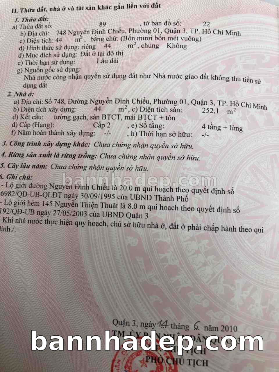 BÁN NHÀ Mặt tiền Số 748 Nguyễn Đình Chiểu phường 01 quận 3 TP. Hồ Chí Minh – GẦN CÔNG VIÊN GIẢI TRÍ – GIÁ TỐT Cần bán gấp nhà Mặt tiền tại Số 748 Nguyễn Đình Chiểu phường 01 quận 3 TP. Hồ Chí Minh – tiềm năng kinh doanh cao. Thông tin chi tiết: • Địa chỉ: Số 748 Nguyễn Đình Chiểu phường 01 quận 3 TP. Hồ Chí Minh • Diện tích: như trong sổ, không gian lý tưởng • Vị trí: Mặt tiền đường Nguyễn Đình Chiểu, gần trung tâm thương mại lớn, khu vực sầm uất, tiềm năng kinh doanh cao • Pháp lý: Sổ hồng riêng, không tranh chấp, sẵn sàng giao dịch • Giá bán: Thoả Thuận (còn thương lượng với khách thiện chí) Lợi thế đặc biệt: • Vị trí trung tâm Quận 3 • Giao thông thuận tiện, kết nối các quận trung tâm • Phù hợp kinh doanh dài hạn, ổn định • Khu vực sầm uất, tiềm năng kinh doanh tốt