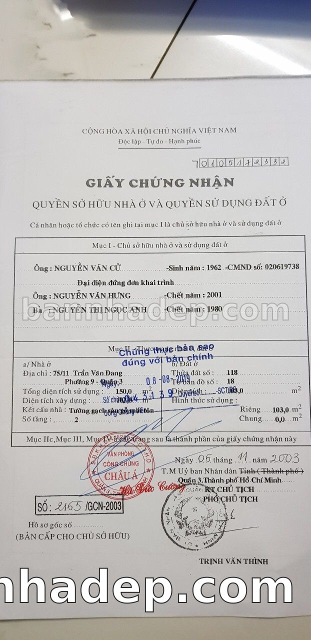 BÁN NHÀ Đường hẻm Số 75/11 Trần Văn Đang phường 09 quận 3 TP. Hồ Chí Minh – GẦN CÔNG VIÊN GIẢI TRÍ – GIÁ TỐT Cần bán gấp nhà Đường hẻm tại Số 75/11 Trần Văn Đang phường 09 quận 3 TP. Hồ Chí Minh – tiềm năng kinh doanh cao. Thông tin chi tiết: • Địa chỉ: Số 75/11 Trần Văn Đang phường 09 quận 3 TP. Hồ Chí Minh • Diện tích: như trong sổ, không gian lý tưởng • Vị trí: Đường hẻm đường Trần Văn Đang, gần trung tâm thương mại lớn, khu vực sầm uất, tiềm năng kinh doanh cao • Pháp lý: Sổ hồng riêng, không tranh chấp, sẵn sàng giao dịch • Giá bán: Thoả Thuận (còn thương lượng với khách thiện chí) Lợi thế đặc biệt: • Vị trí trung tâm Quận 3 • Giao thông thuận tiện, kết nối các quận trung tâm • Phù hợp kinh doanh dài hạn, ổn định • Khu vực sầm uất, tiềm năng kinh doanh tốt