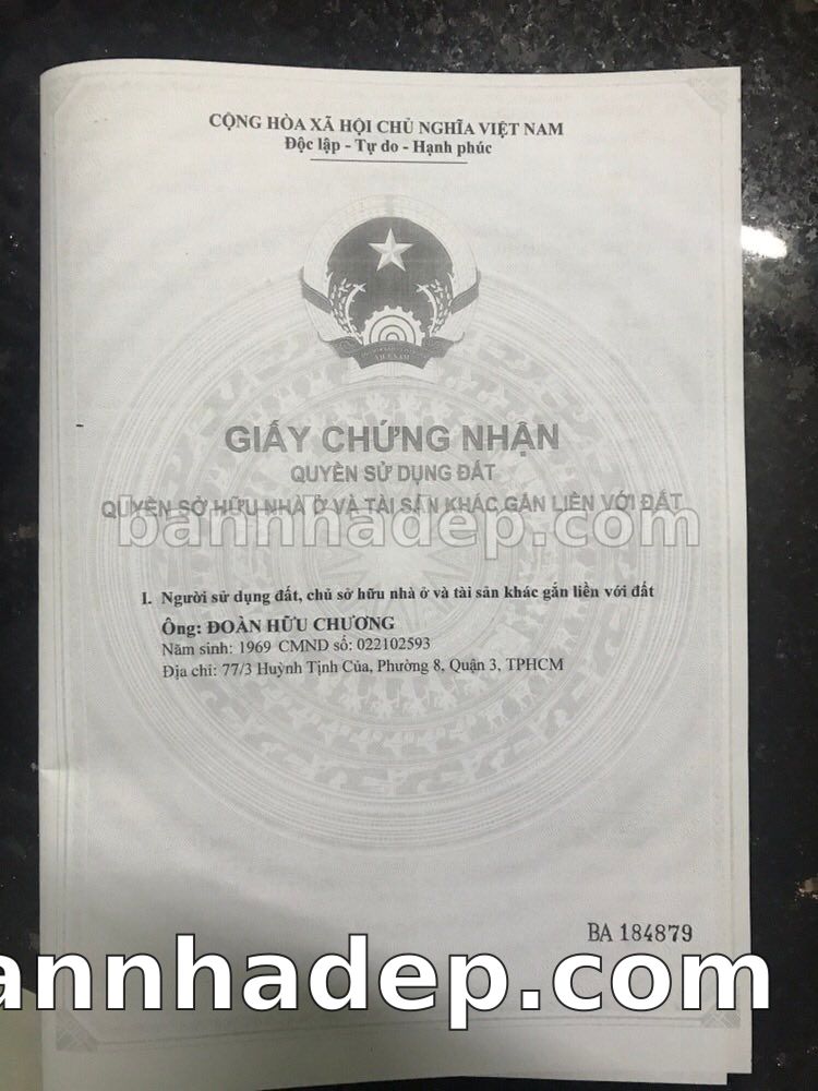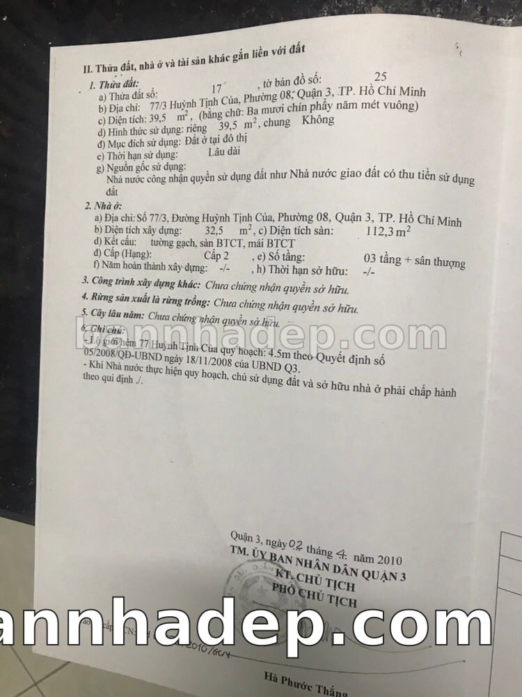 BÁN NHÀ Đường hẻm Số 77/3 Huỳnh Tịnh Của phường 08 quận 3 TP. Hồ Chí Minh – GẦN CÔNG VIÊN GIẢI TRÍ – GIÁ TỐT Cần bán gấp nhà Đường hẻm tại Số 77/3 Huỳnh Tịnh Của phường 08 quận 3 TP. Hồ Chí Minh – tiềm năng kinh doanh cao. Thông tin chi tiết: • Địa chỉ: Số 77/3 Huỳnh Tịnh Của phường 08 quận 3 TP. Hồ Chí Minh • Diện tích: như trong sổ, không gian lý tưởng • Vị trí: Đường hẻm đường Huỳnh Tịnh Của, gần trung tâm thương mại lớn, khu vực sầm uất, tiềm năng kinh doanh cao • Pháp lý: Sổ hồng riêng, không tranh chấp, sẵn sàng giao dịch • Giá bán: Thoả Thuận (còn thương lượng với khách thiện chí) Lợi thế đặc biệt: • Vị trí trung tâm Quận 3 • Giao thông thuận tiện, kết nối các quận trung tâm • Phù hợp kinh doanh dài hạn, ổn định • Khu vực sầm uất, tiềm năng kinh doanh tốt