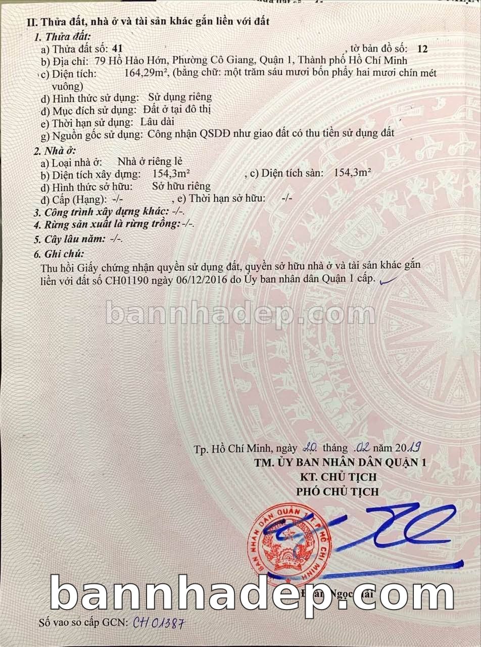 BÁN NHÀ MẶT TIỀN Số 79 Hồ Hảo Hớn Phường Cô Giang Quận 1 TP. Hồ Chí Minh – GẦN TRUNG TÂM THƯƠNG MẠI LỚN – GIÁ CỰC TỐT 180 TỶ Cần bán nhà mặt tiền tại Số 79 Hồ Hảo Hớn Phường Cô Giang Quận 1 TP. Hồ Chí Minh. Thông tin chi tiết: • Địa chỉ: Số 79 Hồ Hảo Hớn Phường Cô Giang Quận 1 TP. Hồ Chí Minh • Diện tích: 8.4m x 19.6m, không gian thoáng đãng • Vị trí: Mặt tiền đường Hồ Hảo Hớn, gần công viên, khu vực dân cư đông đúc • Pháp lý: Sổ hồng riêng, quy hoạch rõ ràng, sẵn sàng sang tên • Giá bán: 180 Tỷ (giá tốt, có thể thương lượng) Ưu điểm nổi bật: • Vị trí đắc địa, tiềm năng sinh lời cao • Giao thông thuận tiện, kết nối các quận trung tâm • Khu vực sầm uất, tiềm năng kinh doanh tốt • Khu vực phát triển, tiềm năng tăng trưởng cao