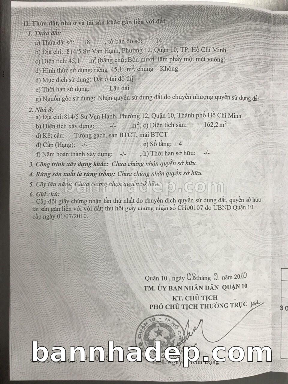 BÁN NHÀ Đường hẻm Số 814/5 Sư Vạn Hạnh phường 01 quận 10 TP. Hồ Chí Minh – GẦN CÔNG VIÊN GIẢI TRÍ – GIÁ TỐT Cần bán gấp nhà Đường hẻm tại Số 814/5 Sư Vạn Hạnh phường 01 quận 10 TP. Hồ Chí Minh – tiềm năng kinh doanh cao. Thông tin chi tiết: • Địa chỉ: Số 814/5 Sư Vạn Hạnh phường 01 quận 10 TP. Hồ Chí Minh • Diện tích: như trong sổ, không gian lý tưởng • Vị trí: Đường hẻm đường Sư Vạn Hạnh, gần trung tâm thương mại lớn, khu vực sầm uất, tiềm năng kinh doanh cao • Pháp lý: Sổ hồng riêng, không tranh chấp, sẵn sàng giao dịch • Giá bán: Thoả Thuận (còn thương lượng với khách thiện chí) Lợi thế đặc biệt: • Vị trí trung tâm Quận 10 • Giao thông thuận tiện, kết nối các quận trung tâm • Phù hợp kinh doanh dài hạn, ổn định • Khu vực sầm uất, tiềm năng kinh doanh tốt