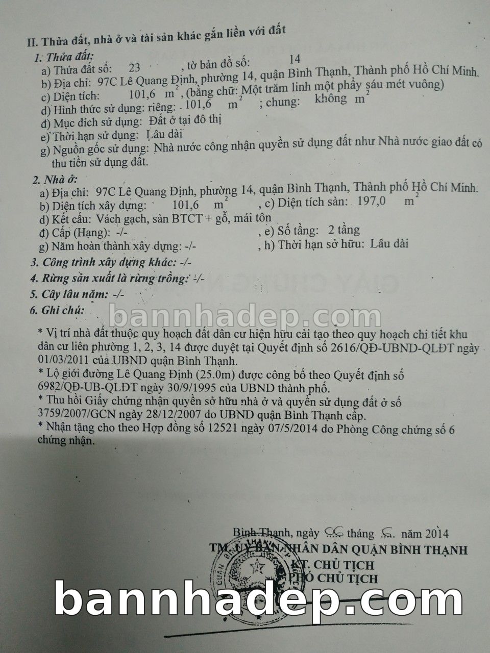 BÁN NHÀ Mặt tiền Số 97C Lê Quang Định phường 01 quận Bình Thạnh TP. Hồ Chí Minh – GẦN CÔNG VIÊN GIẢI TRÍ – GIÁ TỐT Cần bán gấp nhà Mặt tiền tại Số 97C Lê Quang Định phường 01 quận Bình Thạnh TP. Hồ Chí Minh – tiềm năng kinh doanh cao. Thông tin chi tiết: • Địa chỉ: Số 97C Lê Quang Định phường 01 quận Bình Thạnh TP. Hồ Chí Minh • Diện tích: như trong sổ, không gian lý tưởng • Vị trí: Mặt tiền đường Lê Quang Định, gần trung tâm thương mại lớn, khu vực sầm uất, tiềm năng kinh doanh cao • Pháp lý: Sổ hồng riêng, không tranh chấp, sẵn sàng giao dịch • Giá bán: Thoả Thuận (còn thương lượng với khách thiện chí) Lợi thế đặc biệt: • Vị trí trung tâm Quận Bình Thạnh • Giao thông thuận tiện, kết nối các quận trung tâm • Phù hợp kinh doanh dài hạn, ổn định • Khu vực sầm uất, tiềm năng kinh doanh tốt