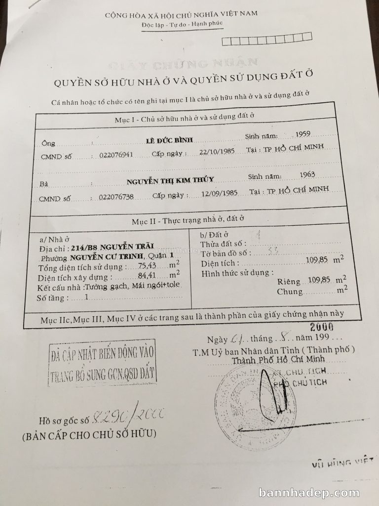 Bán nhà 214/B8 Nguyễn Trãi phường Nguyễn Cư Trinh quận 1