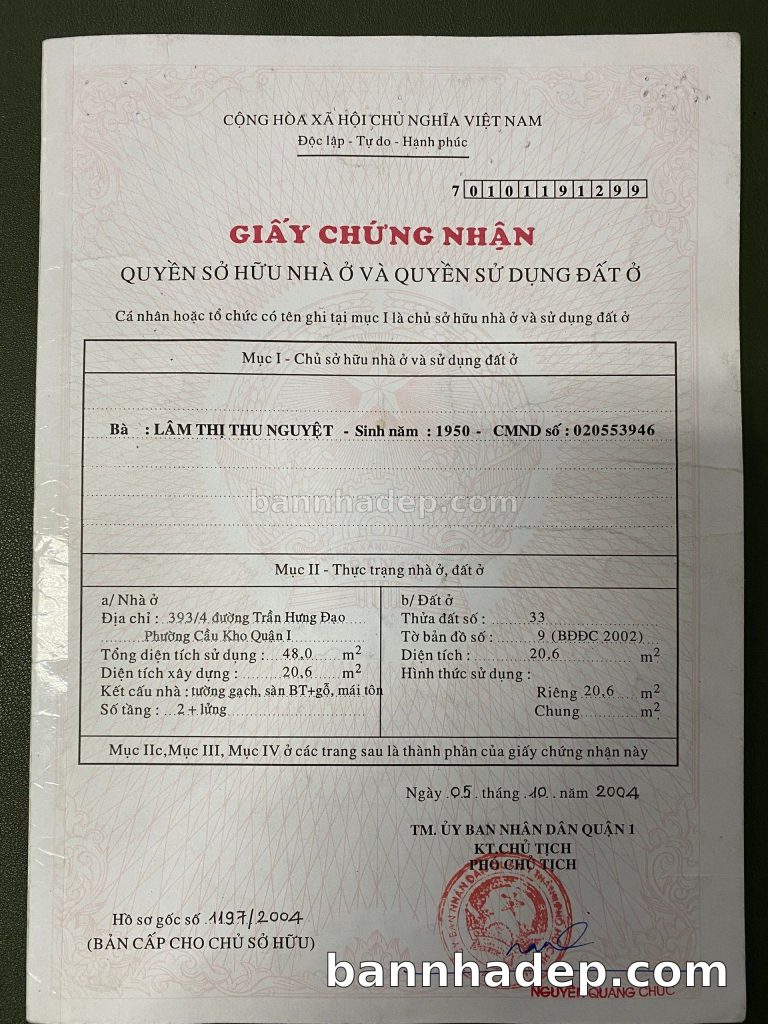 Bán nhà 339/4 Trần Hưng Đạo phường Cầu Kho quận 1