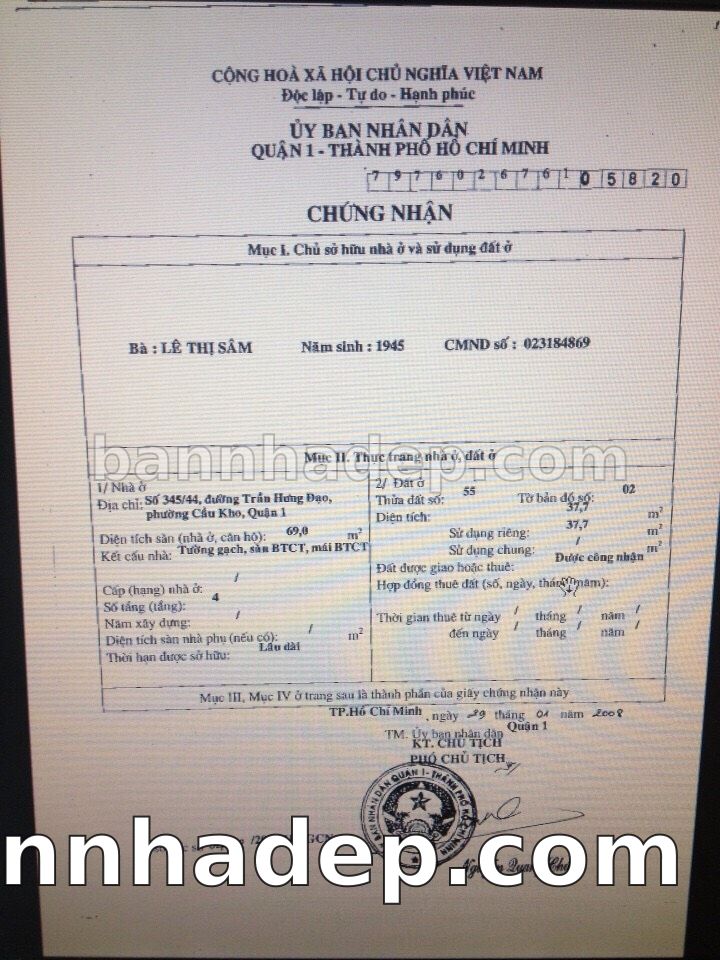 Bán nhà 345/86 Trần Hưng Đạo phường Cầu Kho quận 1