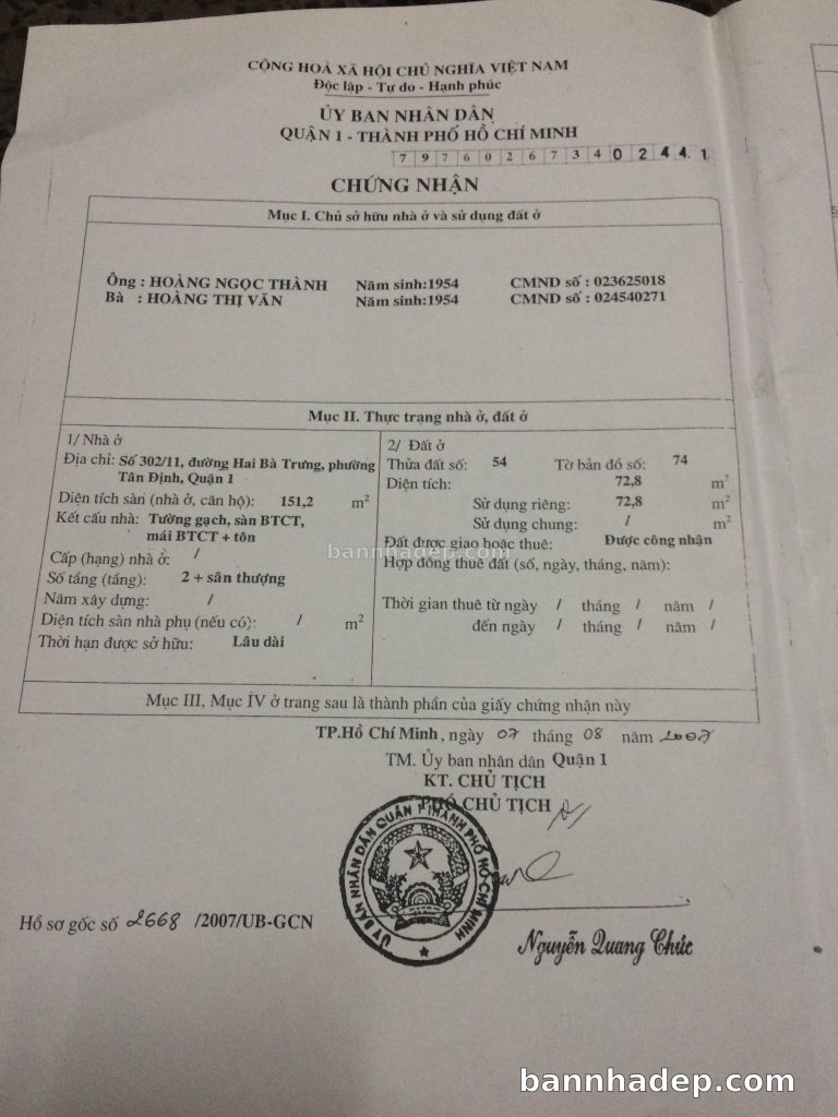 Bán nhà 302/11 Hai Bà Trưng phường Tân Định quận 1