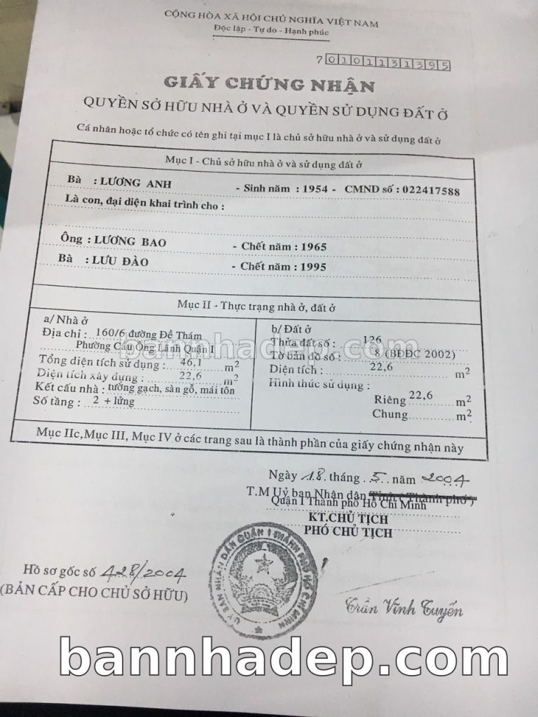 Bán nhà 160/6 Đường Đề Thám phường Cầu Ông Lãnh quận 1