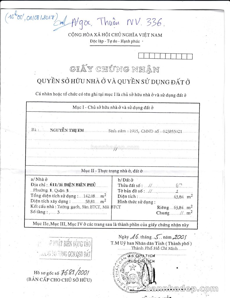 Bán nhà 611/22 Điện Biên Phủ phường 01 quận 3